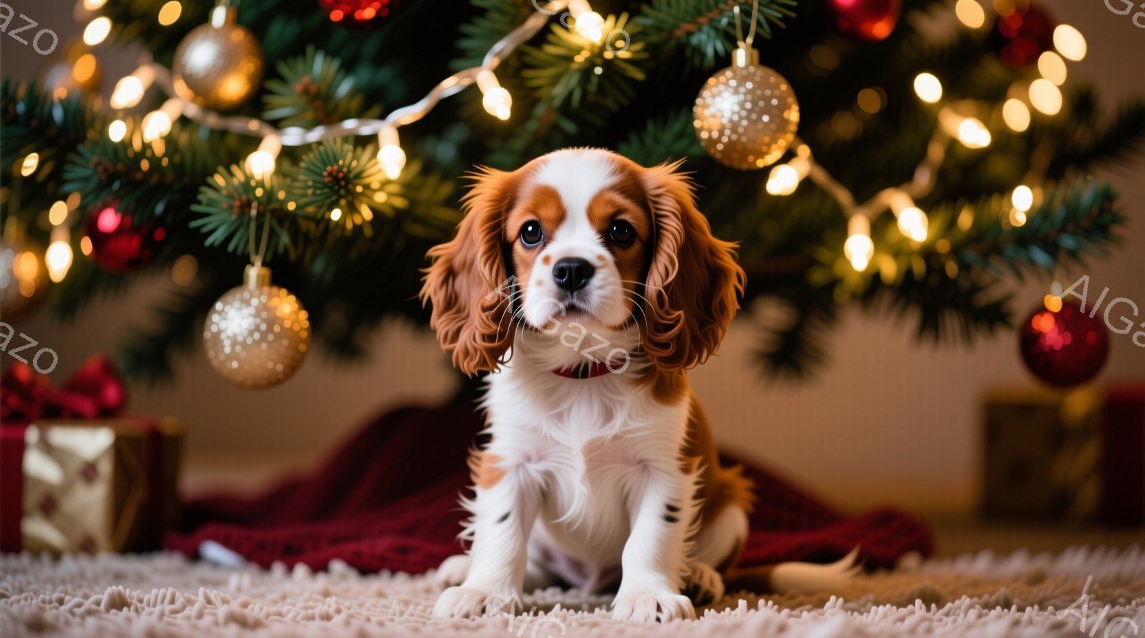 鮮やかなクリスマスの背景の前で、かわいらしい茶色と白のパピヨン犬が座っています。犬は真っ直ぐ前を見つめ、穏やかで好奇心に満ちた表情をしています。背景には、飾り付けられたクリスマスツリーとぼやけたライトがあり、暖かくお祝いの雰囲気を醸し出しています。