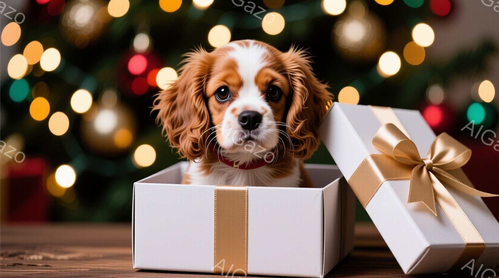 この無料AI生成画像「白とオレンジ色の毛並みのキャバリア・キング・チャールズ・スパニエルが、クリスマスツリーの赤いオーナメントに前足を伸ばして触れようとしています。犬は赤い首輪をつけており、好奇心と遊び心に満ちた表情で、ツリーの緑の葉とキラキラと輝く装飾に囲まれています。背景はぼかされており、暖かくお祝いムードに満ちた雰囲気が漂っています。」は、2025年10月24日に作成されました。 サイズは 1664×928px の高解像度で、商用利用も可能なフリー素材として提供しています。