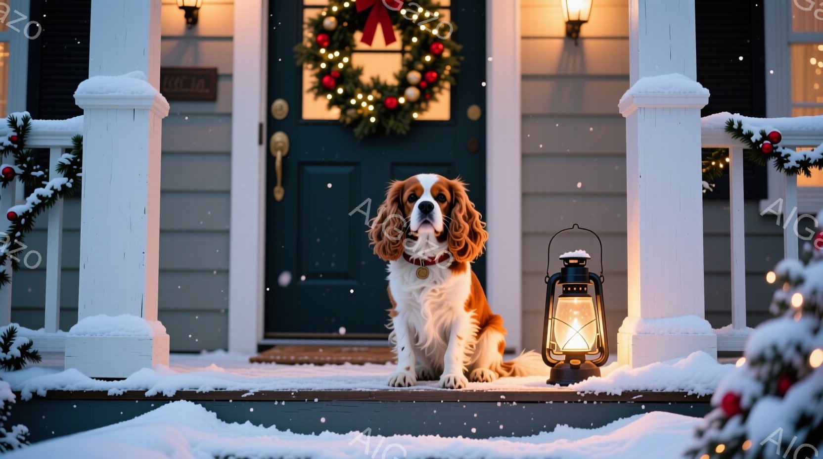 白と茶色の美しいキャバリア・キング・チャールズ・スパニエルが、雪が積もった家の外の階段に座っています。クリスマスのリースが飾られた黒いドアと、点灯したランタンが暖かく穏やかな雰囲気を醸し出しています。背景には、雪で覆われた手すりと建物の壁があり、冬の穏やかな夜の様子が表現されています。