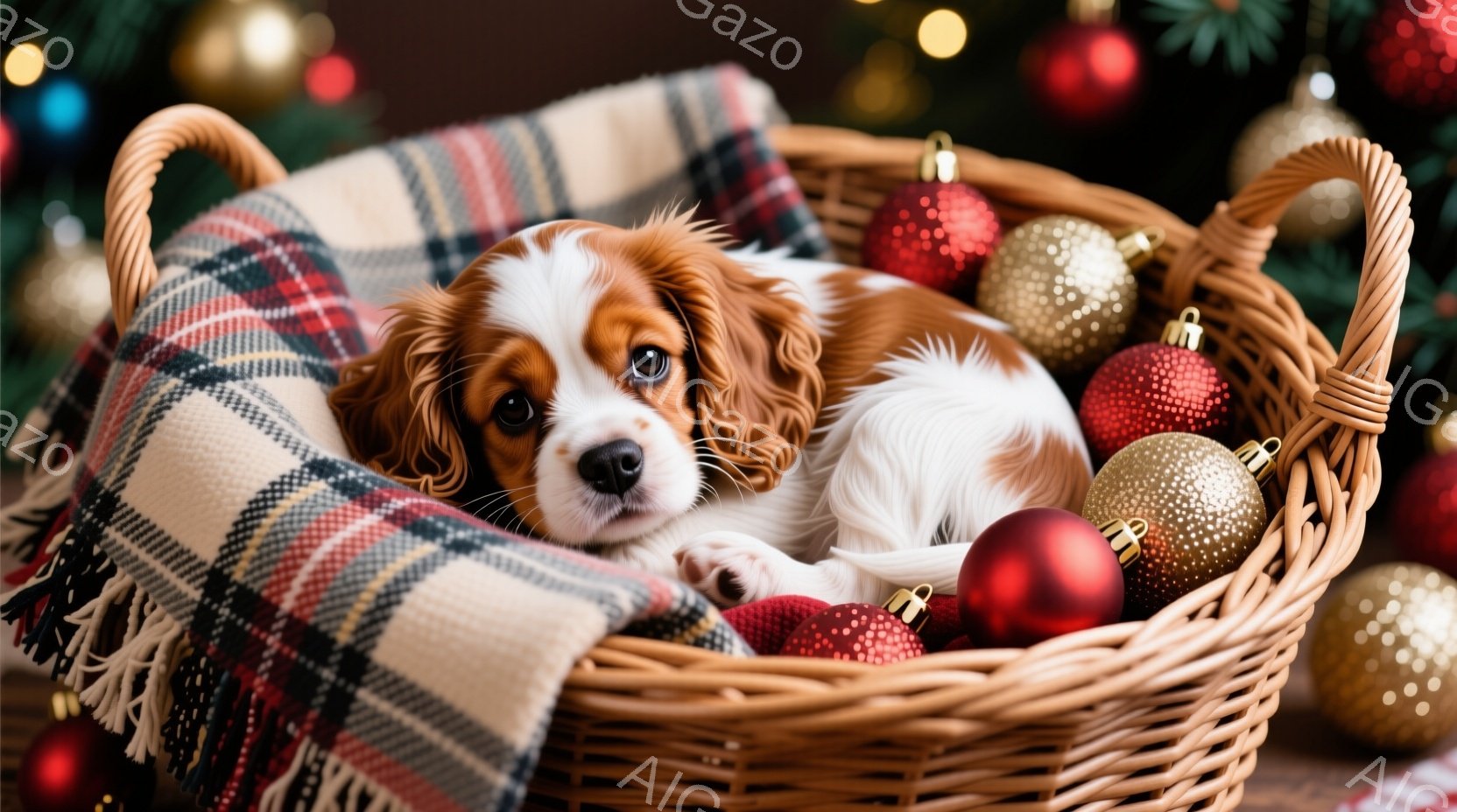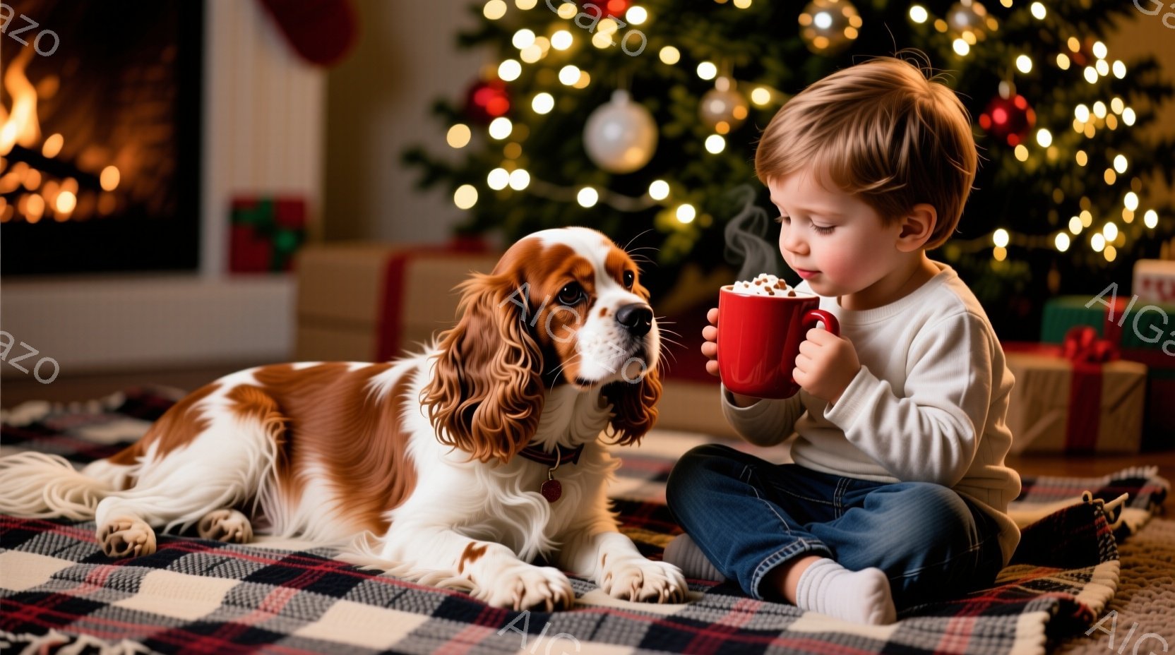 少年は膝を曲げて座り、暖かい飲み物を入れたマグカップを両手で抱えています。そばには、白い胸と赤い毛並みを持つスパニエル犬が横たわり、少年を見つめています。背景にはクリスマスツリーが飾られ、暖炉の炎が暖かく輝き、全体的に穏やかで居心地の良い冬の雰囲気が漂っています。