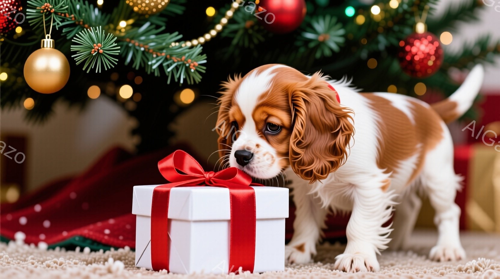 窓辺に座った茶色と白のコッカー・スパニエルが雪景色を物憂げに見つめている。犬は黒いセーターのようなものを着ており、毛並みはふさふさとしている。背景にはぼやけたクリスマスツリーの光が暖かく、外は雪が降り積もり、冬の静かで穏やかな雰囲気を醸し出している。