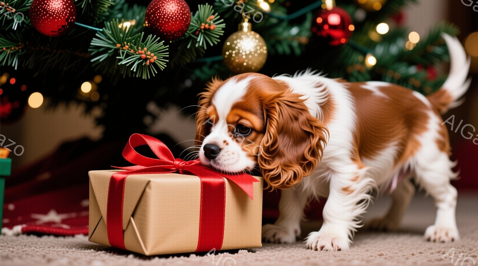 白とオレンジ色の毛並みを持つ子犬が、赤いリボンと水玉模様のラッピングペーパーで飾られたプレゼントの箱に鼻を近づけています。背景には、クリスマスツリーの緑と、ぼんやりとしたオーナメントの光があり、暖かくお祝いムードの雰囲気を醸し出しています。柔らかい毛並みと好奇心に満ちた表情から、子犬はプレゼントに興味津々であることが伝わってきます。