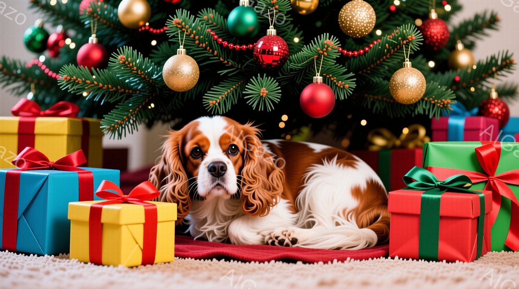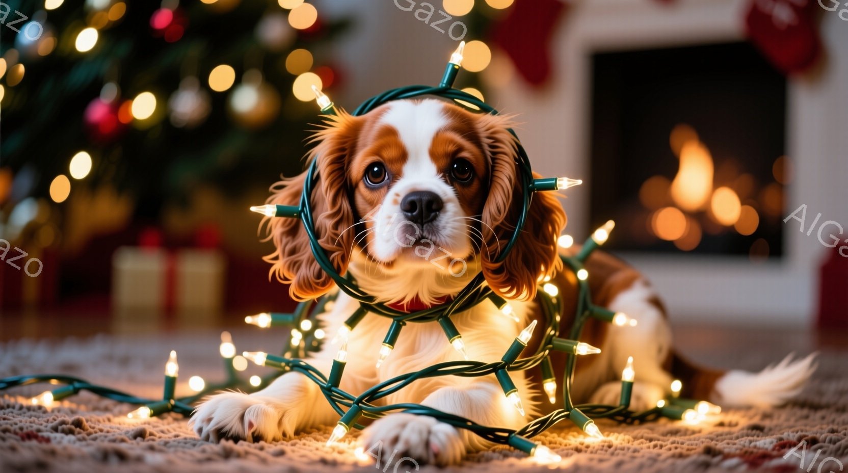 暖炉とクリスマスツリーがぼんやりと見える室内で、茶色と白の毛並みの犬がイルミネーションライトに包まれています。犬はカーペットの上に仰向けになり、リラックスした表情でカメラを見つめており、その愛らしい姿が印象的です。部屋全体が温かく、穏やかなクリスマスの雰囲気に包まれています。