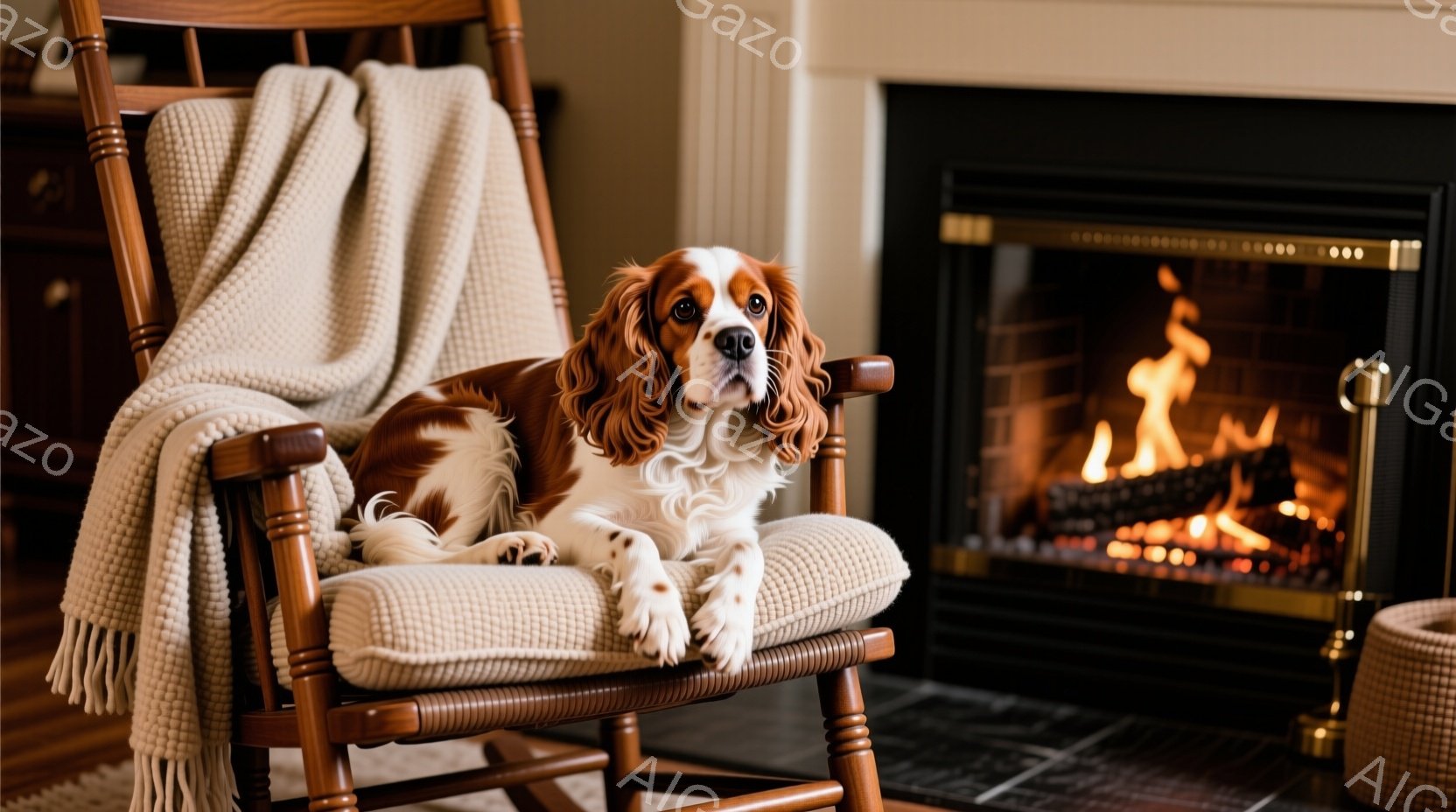 明るい色のロッキングチェアに、クリームと茶色の模様の可愛い犬がくつろいでいる。犬はリラックスした表情で、正面を見つめており、背景には暖炉があり、炎が燃え盛っているのが見える。全体的に暖かく、穏やかな家庭的な雰囲気が漂っている。