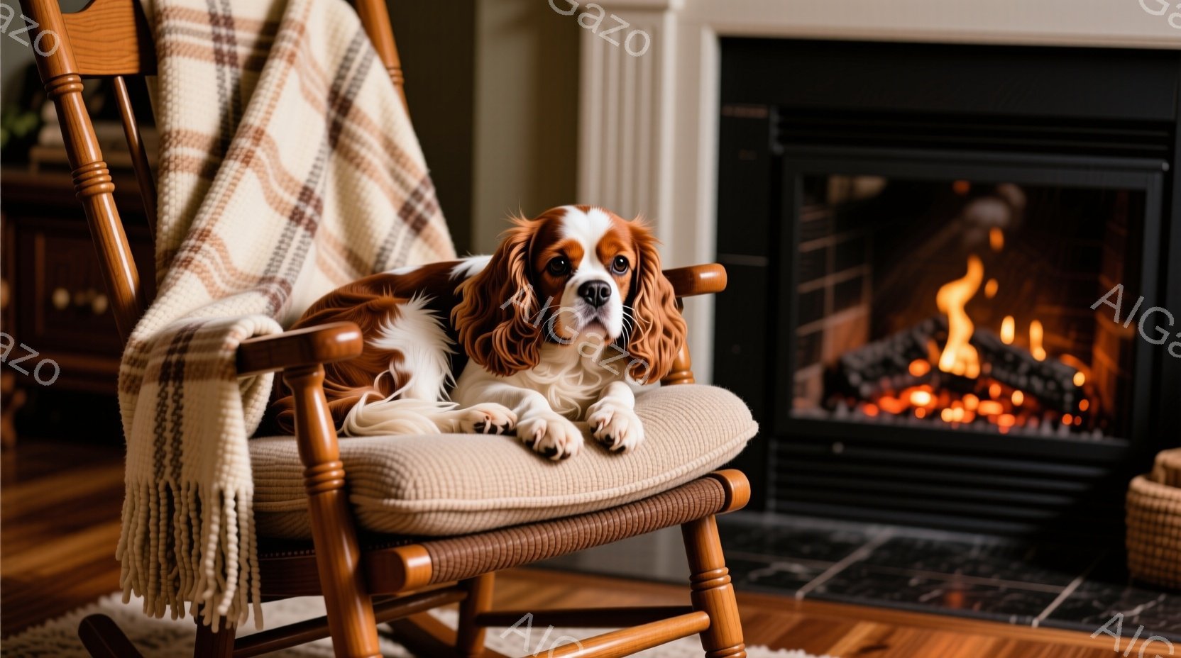 暖炉の前に置かれたロッキングチェアに、茶色と白の毛並みの犬がゆったりと横たわっています。犬はリラックスした表情で、ロッキングチェアにかかったチェック柄のブランケットに寄りかかっています。背景にはレンガ造りの暖炉があり、炎が暖かく灯り、居心地の良い雰囲気を醸し出しています。