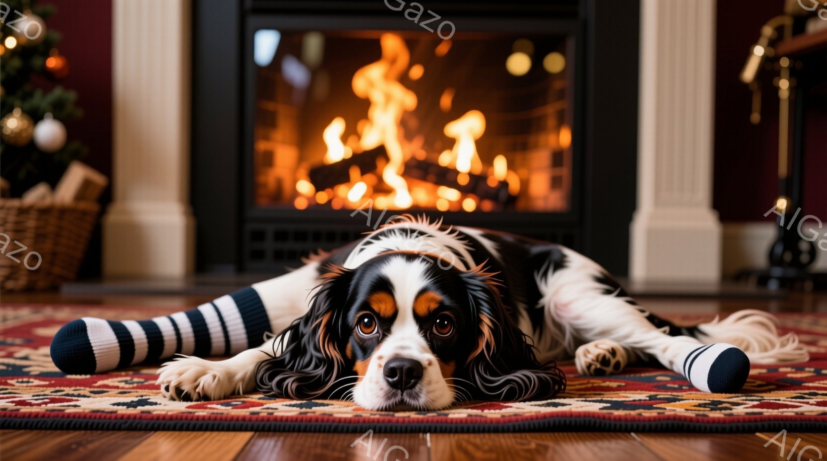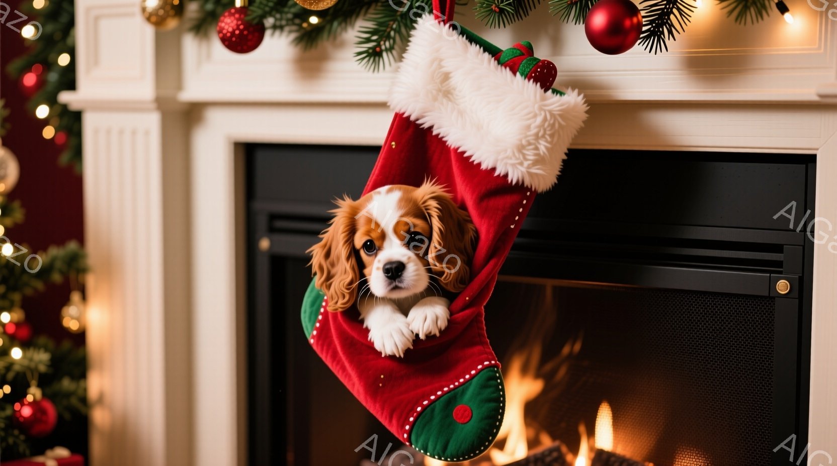 赤いクリスマスストッキングの中から、小さな茶色と白の毛並みの犬が顔を出しています。暖炉の火が暖かく光り、クリスマスツリーの飾りとプレゼントが背景に見えます。全体的に暖かく、お祝いの雰囲気が漂っています。
