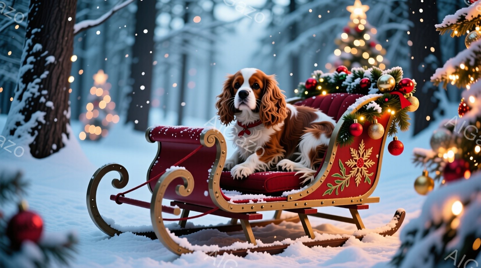 雪景色の中に赤いそりが置かれ、その中にクリーム色のキャバリア・キング・チャールズ・スパニエルが横たわっています。犬はリボンを首につけ、リラックスした表情でそりの座席に体を預れています。背景にはぼやけたクリスマスツリーの光が輝き、雪が舞う冬の暖かく幻想的な雰囲気を醸し出しています。