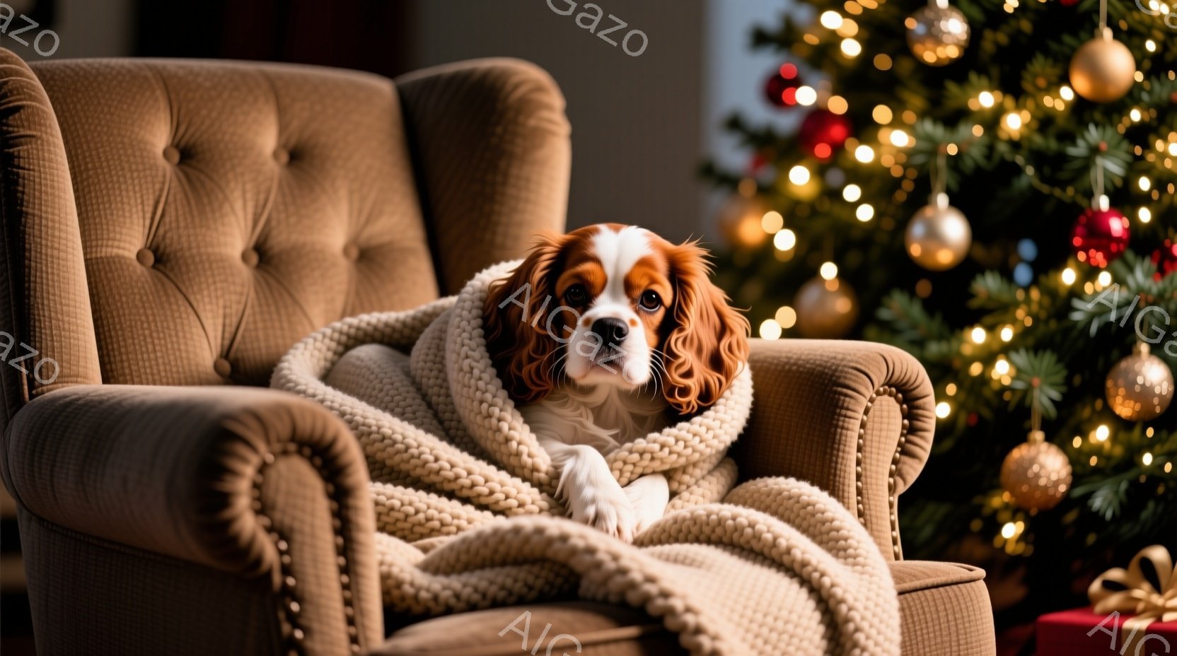 暖炉の前にあるアームチェアに、クリーム色と茶色の毛並みのキャバリア・キング・チャールズ・スパニエルが丸まって座っています。犬はリラックスした表情で、柔らかい毛布に包まれ、穏やかな雰囲気を醸し出しています。背景にはクリスマスツリーが輝き、プレゼントボックスも確認でき、温かく幸せなホリデーシーズンを連想させます。