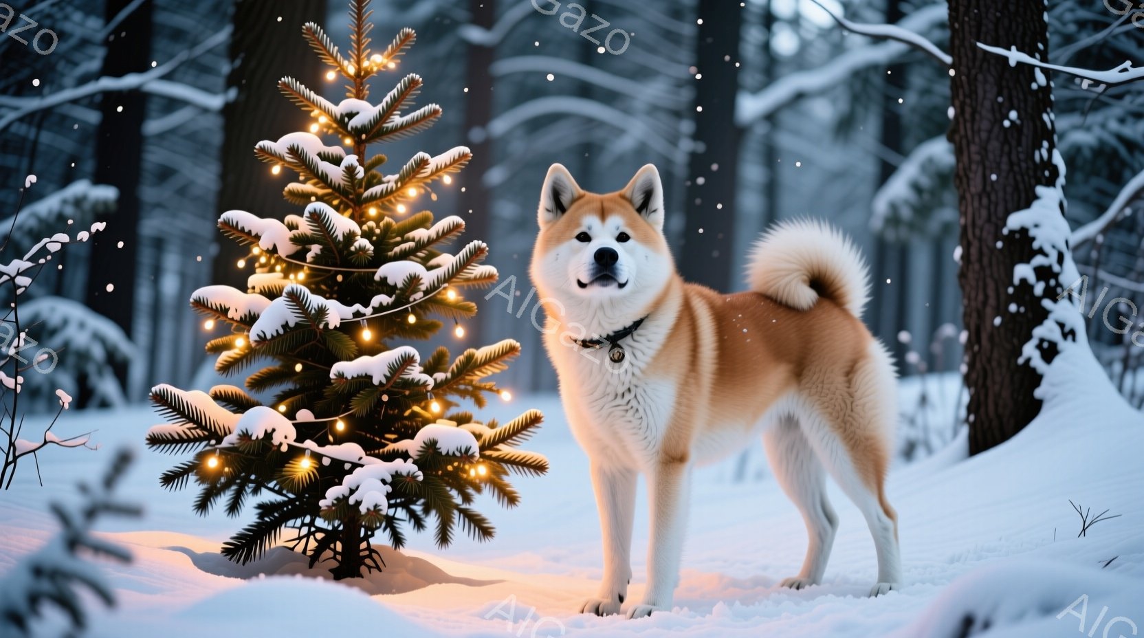 雪景色の中に、可愛らしい柴犬が立っている。背景には、雪で覆われた木々と、電飾で飾られた小さなクリスマスツリーがあり、温かい光が周囲を照らしている。柴犬はまっすぐ前を向き、落ち着いた表情で、冬の静寂と温かさを表現している。