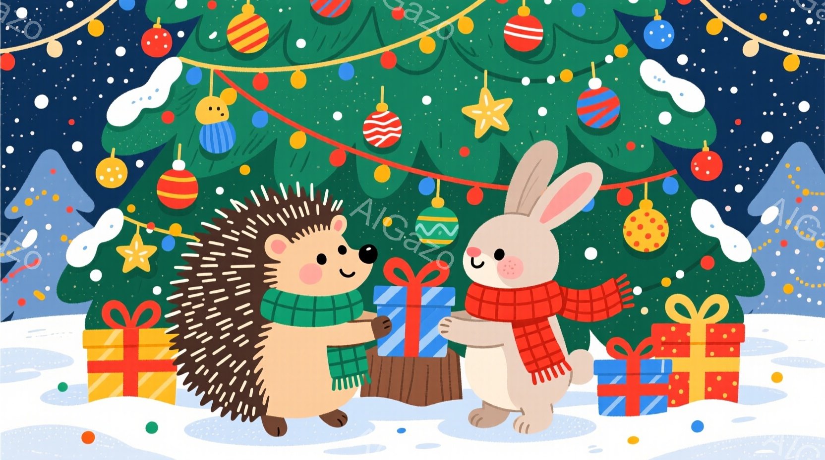 クリスマスツリーを背景に、ハリネズミとウサギがプレゼントを交換しています。二匹とも赤いマフラーを巻いており、笑顔でプレゼントを両手で差し出しています。背景には雪が降り積もり、プレゼント箱がいくつか置かれており、温かく幸せなクリスマスの雰囲気が漂っています。
