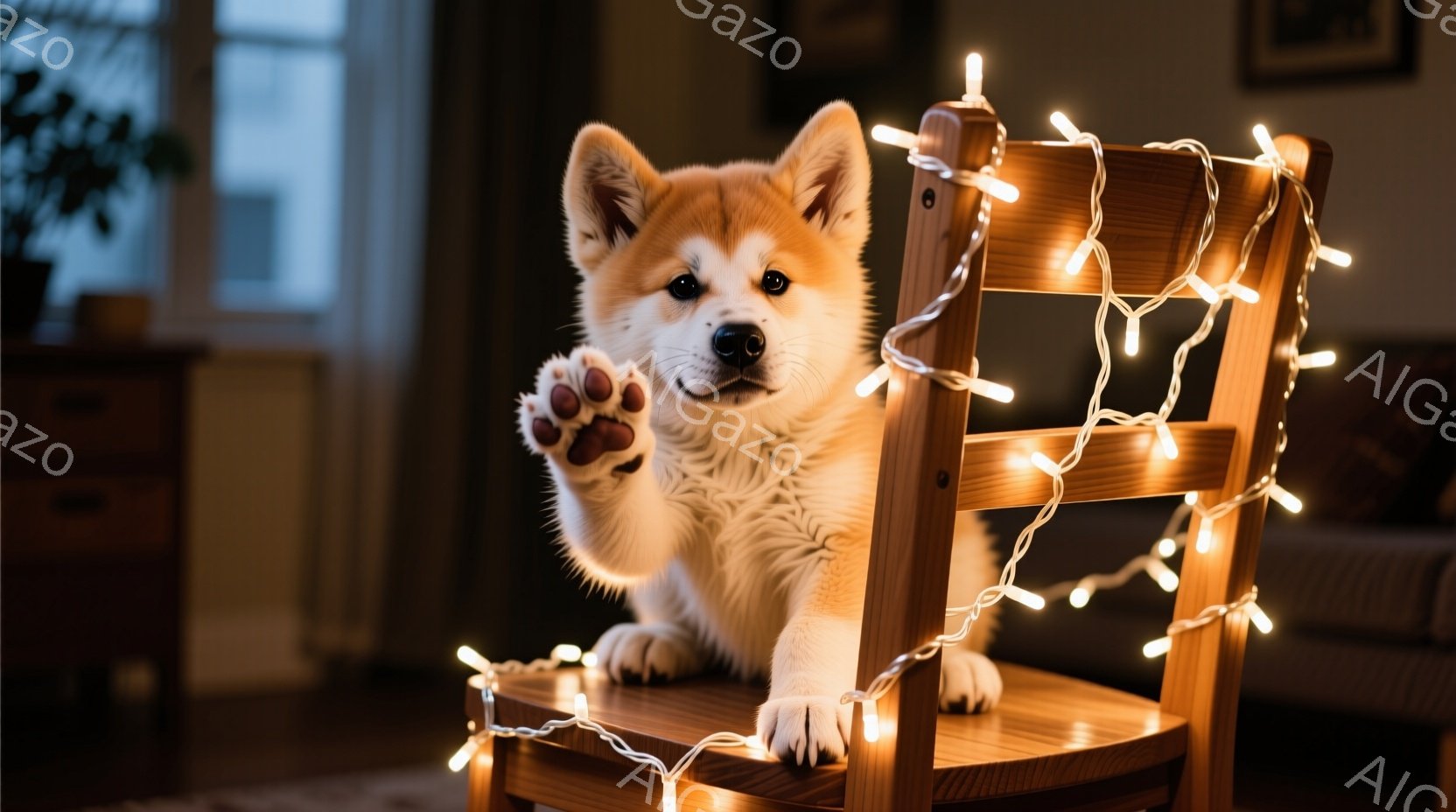 鮮やかなクリーム色の毛並みを持つ秋田犬の子犬が、木製の椅子に座ってこちらを見つめています。子犬は前足を伸ばして何かを掴もうとしているような仕草をしており、その表情は可愛らしく、遊び心に満ちています。背景には、暖かい光を放つクリスマスのような電飾があり、室内全体が柔らかく温かい雰囲気で包まれています。