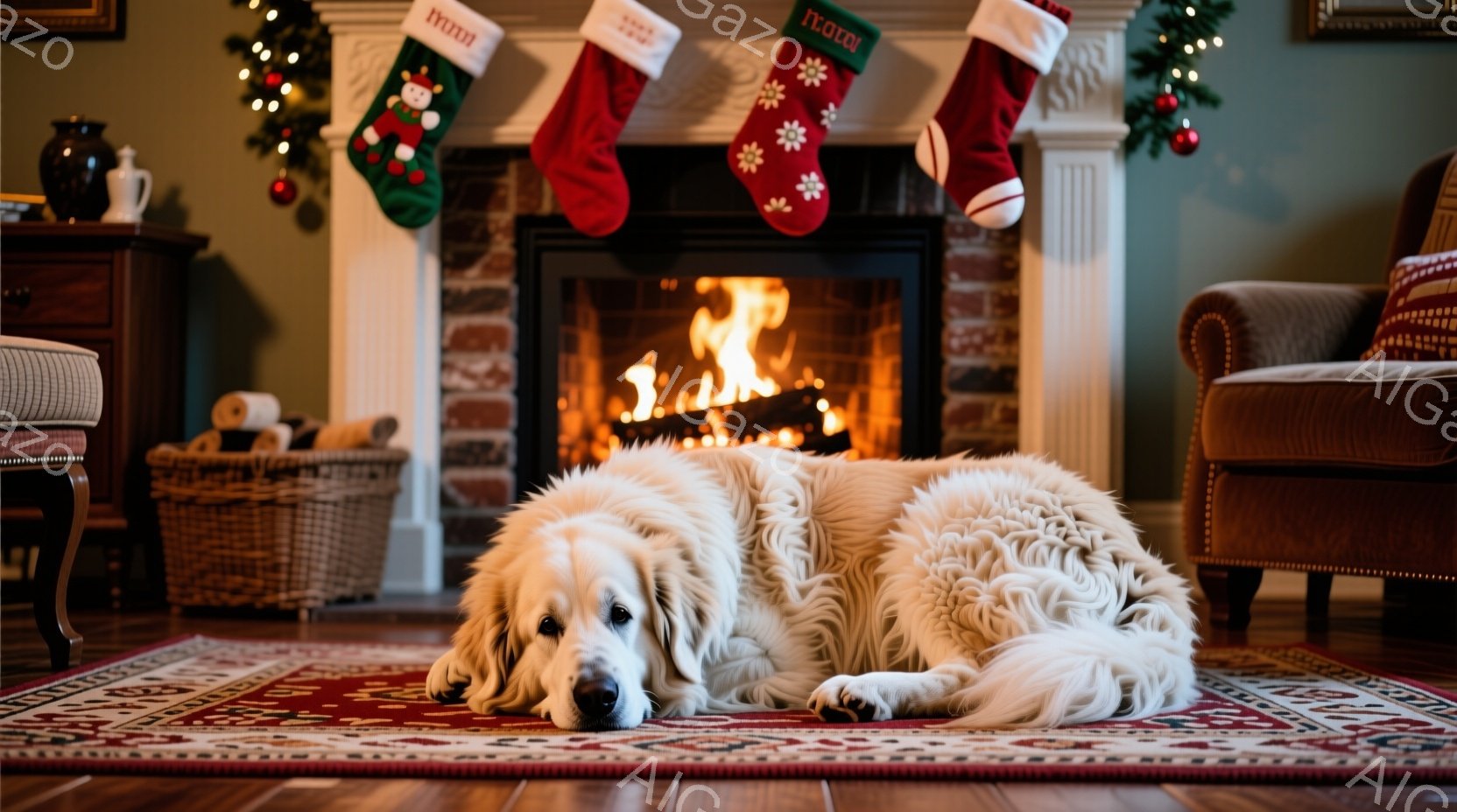 暖炉の前で大きなセント・バーナード犬が、ペルシャ絨毯の上でリラックスして横たわっています。背景には、クリスマスツリーと赤いクリスマスストッキングが飾られ、温かく居心地の良い雰囲気を醸し出しています。暖炉の炎が犬と部屋全体を柔らかい光で照らし、穏やかで平和な冬の情景を表現しています。