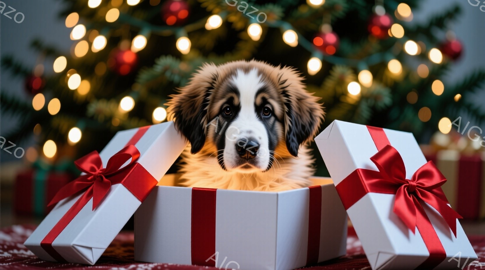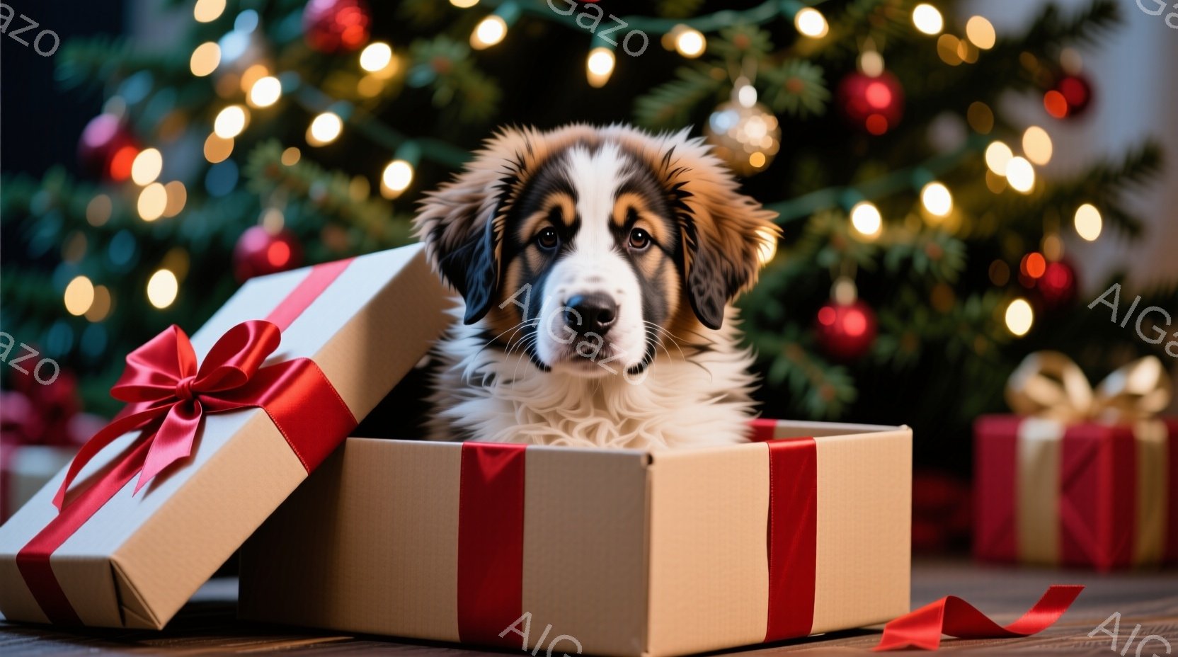 ふわふわの毛並みを持つ犬が、開いたプレゼントボックスから顔を出しています。赤いリボンと包装紙で飾られた箱は、クリスマスの飾り付けに囲まれた床の上に置かれています。背景にはぼやけたクリスマスツリーの光が輝き、温かくお祝いムードに包まれた様子が伝わってきます。