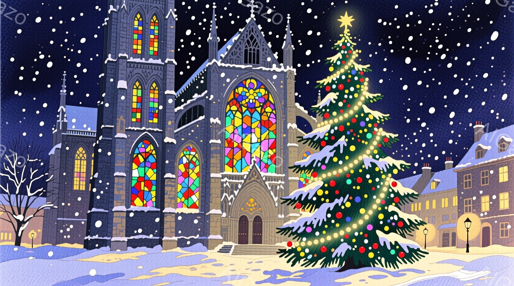 雪が舞う夜の街並みには、壮大なゴシック様式の教会がそびえ立ち、カラフルなステンドグラスが温かい光を放っている。教会の前には、飾り付けられたクリスマスツリーが輝き、街灯の灯りや雪景色と相まって、静かで幻想的な雰囲気を醸し出している。建物は白と暗い色調で描かれ、雪の積もった道と木々が、冬の夜の穏やかさを強調している。
