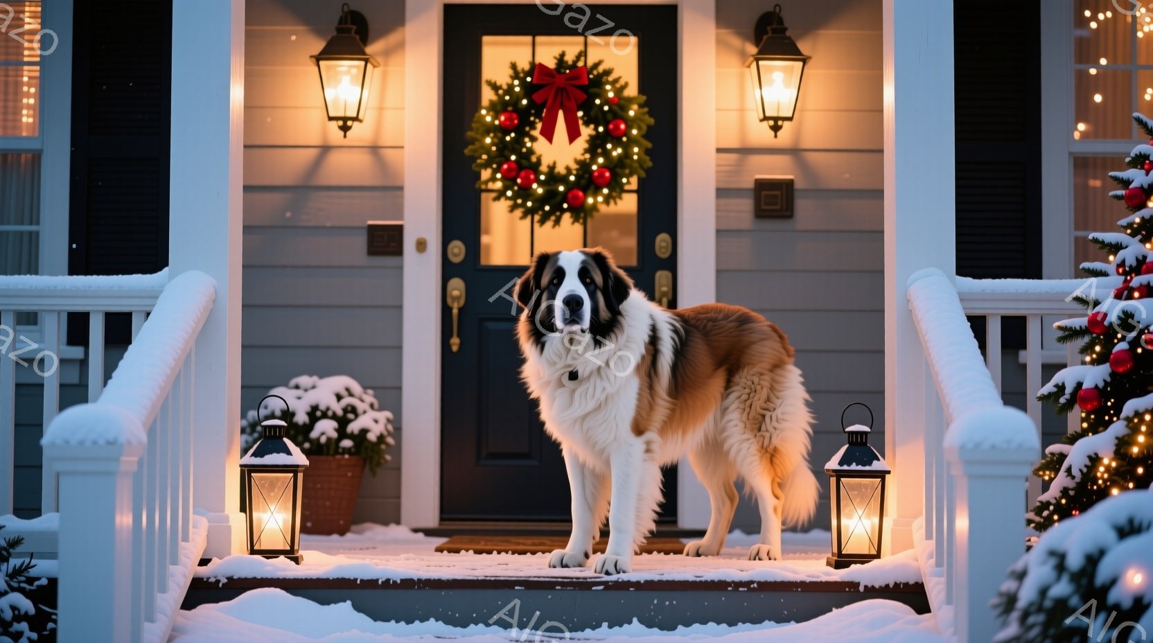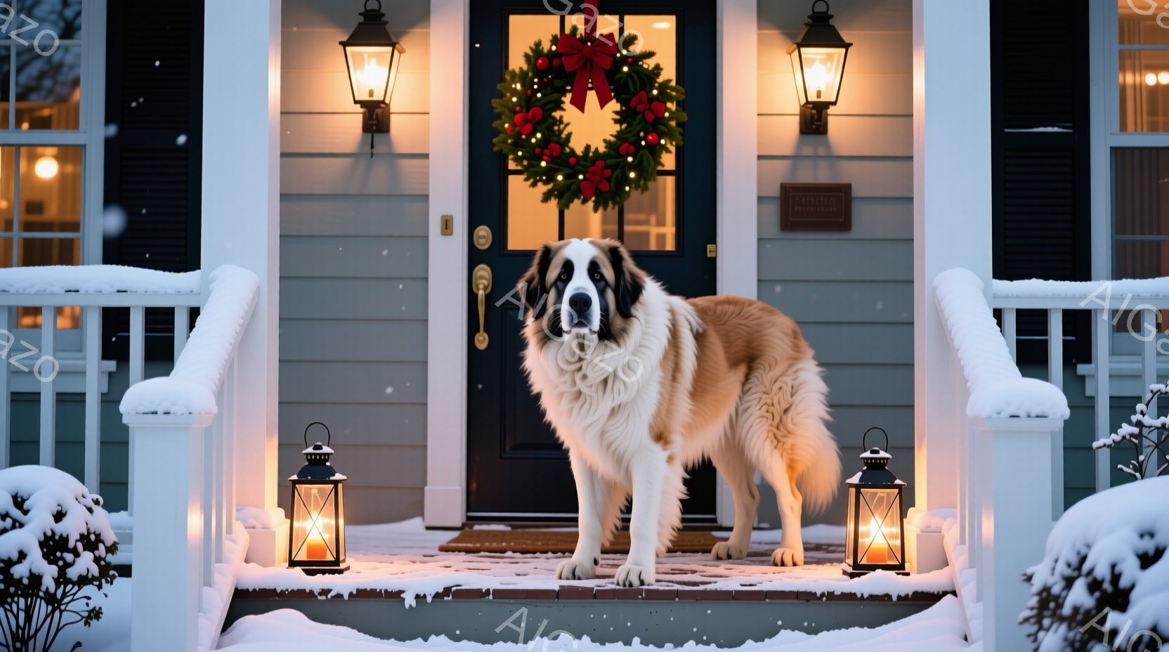 雪が降り積もる家の玄関前に、白い大型犬が立っている。犬はまっすぐ前を見ており、ふわふわとした毛並みが印象的だ。玄関にはクリスマスリースが飾られ、両脇には灯りが灯ったランタンが置かれ、温かい冬の雰囲気を醸し出している。