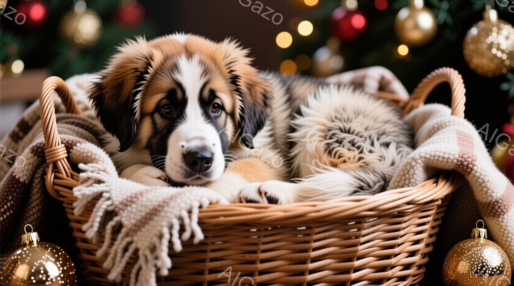 籐のバスケットの中に、ふわふわの毛並みを持つ子犬が丸まって眠っています。子犬はクリーム色と茶色のまだら模様で、穏やかな表情をしています。背景にはぼやけたクリスマスツリーとオーナメントが見え、温かく、居心地の良い雰囲気を醸し出しています。