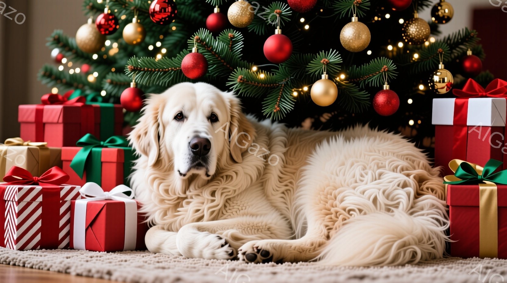 ゴールデンレトリバーがクリスマスツリーの下に横たわり、赤い敷物の上に置かれたプレゼントの箱に囲まれています。犬はリラックスした表情で、わずかに顔を上げ、カメラを見つめています。背景には、オーナメントで飾られた緑のクリスマスツリーがあり、暖かくお祝いの雰囲気を醸し出しています。