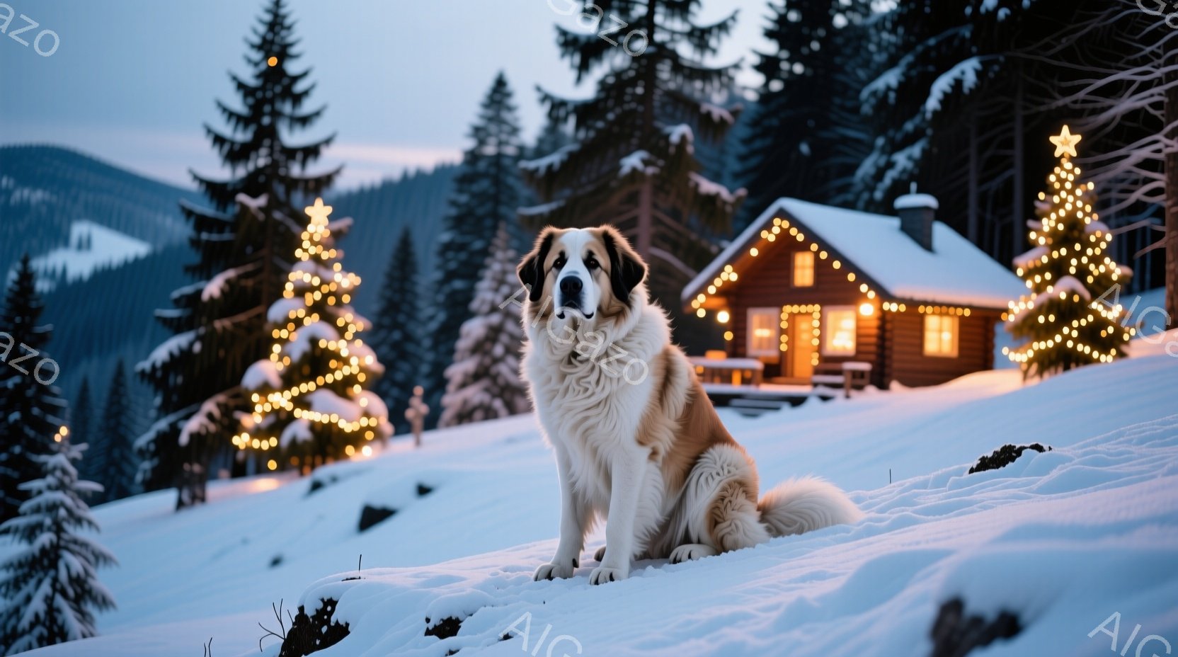 白い毛並みの大型犬が雪の上に座り、遠くを見つめています。背景には、クリスマスツリーのようにライトアップされた木々と、雪に覆われた可愛らしいコテージが見えます。雪が降り積もり、穏やかで冬の暖かさを感じる雰囲気です。
