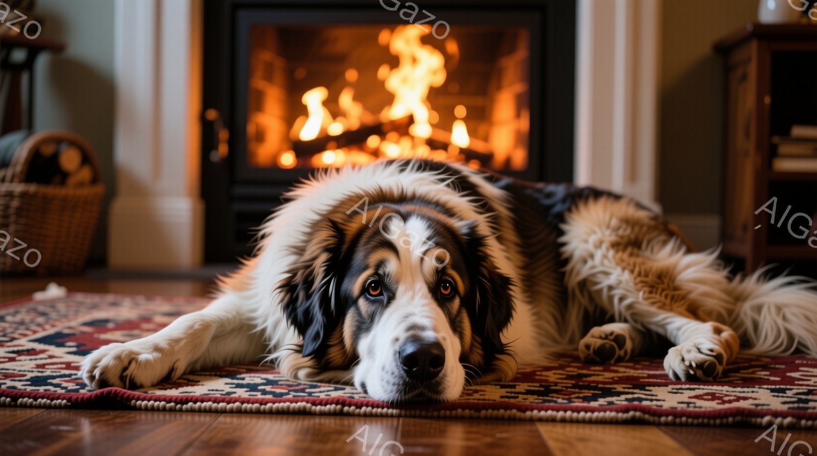 白と黒の毛並みを持つ大型犬が、赤い模様の絨毯の上に横たわっています。犬はリラックスした表情で、正面を見つめており、暖炉の温かい光が犬の毛並みを照らしています。背景には、暖炉と家具が見え、温かく居心地の良い室内空間が広がっています。