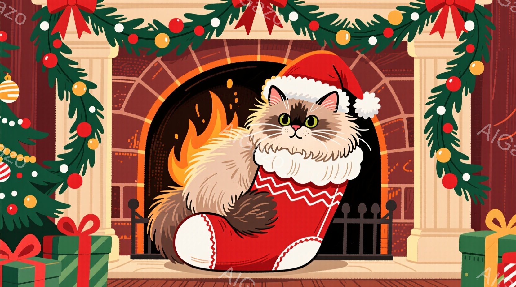 暖炉の前には、赤いクリスマスソックスに身を寄せたふわふわの猫がいます。猫はサンタの帽子をかぶり、楽しそうな表情でこちらを見ています。背景には、緑のガーランド、クリスマスプレゼント、そして暖炉の火が描かれ、温かくお祝いの雰囲気を醸し出しています。