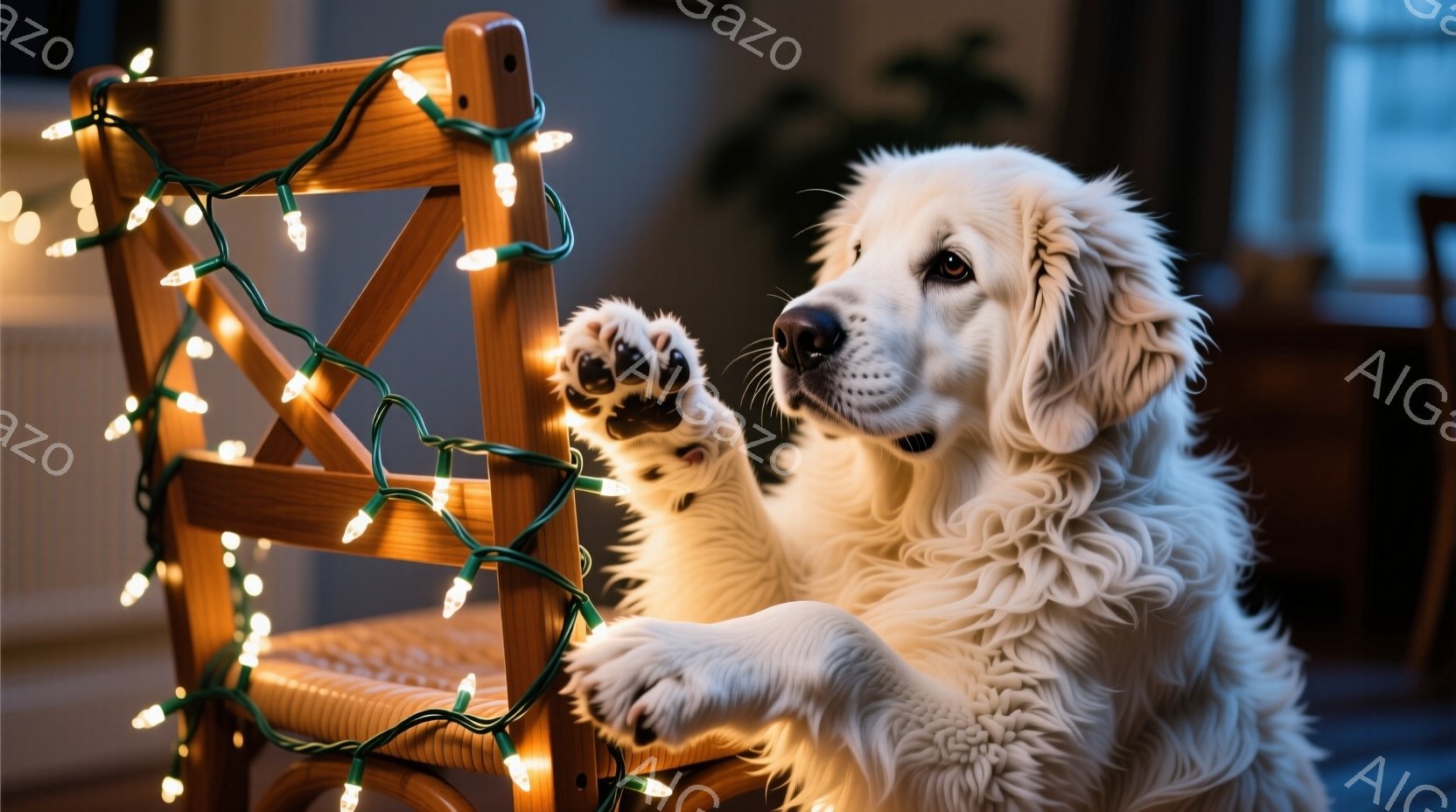 明るい色の椅子に寄りかかり、クリーム色の毛並みのゴールデンレトリバーが写っている。クリスマスのような電飾が椅子に巻き付けられており、犬の足元にも広がっている。背景は暖色系の室内で、穏やかでリラックスした雰囲気が漂っている。
