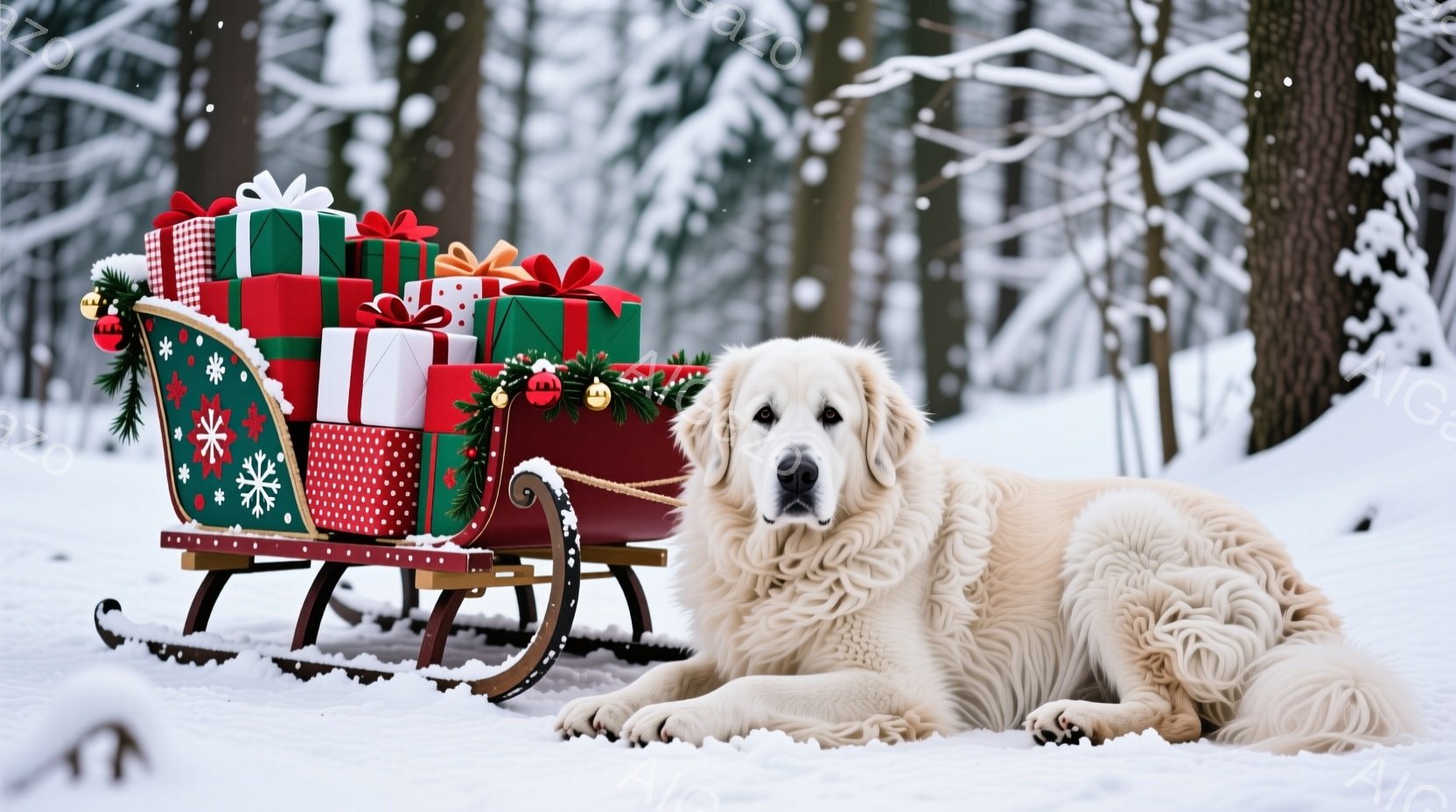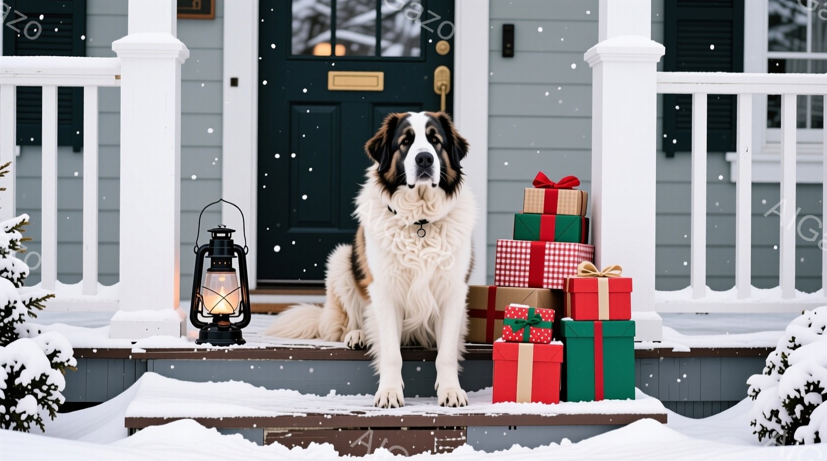 白い毛並みを持つ大型犬が、雪積もった家の玄関の段に座って正面を見つめています。背景には、リボンで飾られた積み重ねられたプレゼントの山があり、左側には点灯したランタンが置かれています。雪が舞う寒い冬の日の、暖かくお祝いムードに満ちた光景です。