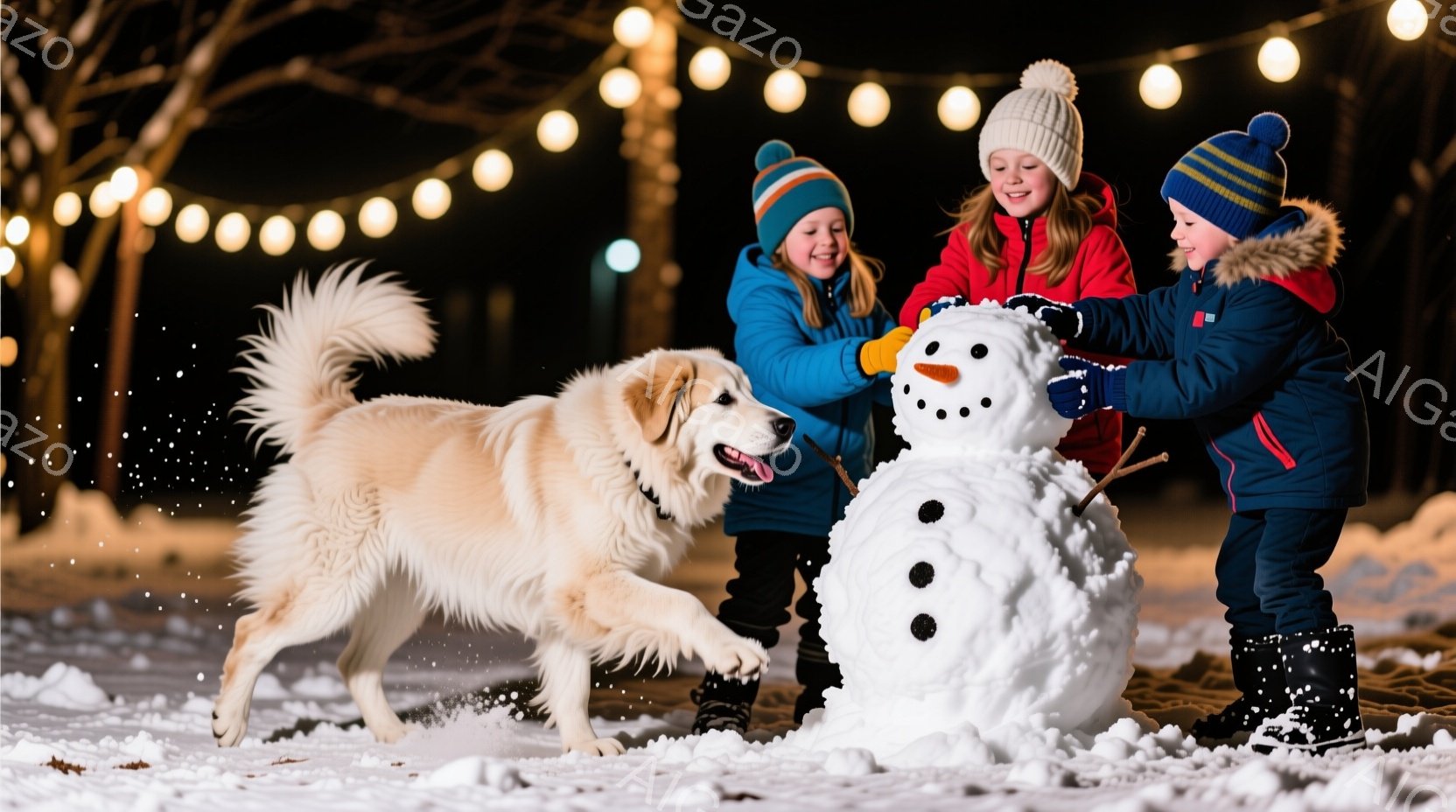 雪景色の中で、二人の子供と一匹の白い犬が雪だるまの飾り付けを楽しんでいる。子供たちは暖かい冬のコートと帽子を着用し、犬は活発に走り回っている。背景には木々があり、上空には電飾が輝き、暖かく幸せな冬の雰囲気を醸し出している。