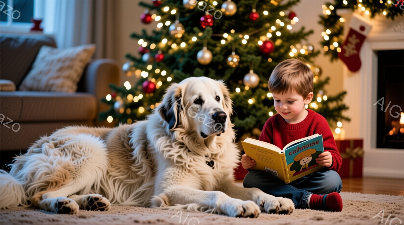 赤毛の少年が床に座り、開いた本を読んでいます。大きな白黒の犬が少年の隣で横になり、本を読んでいる様子を見守っています。背景にはクリスマスツリーが飾られ、プレゼントの箱が置かれている暖かく幸せな雰囲気の室内です。