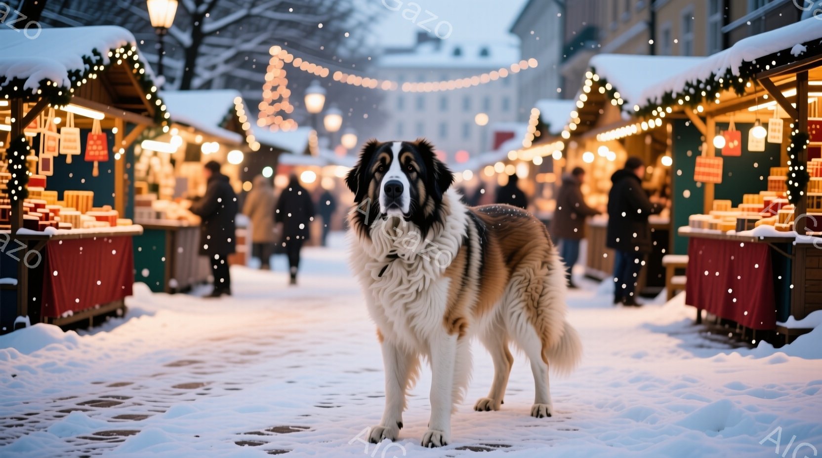 雪が降る市場の通りに、黒と白の大きな犬が立っている。背景には、クリスマスの飾り付けがされた屋台が並び、人々が買い物を楽しんでいる様子が見える。全体的に、暖かく、活気のある冬の雰囲気を感じさせる。