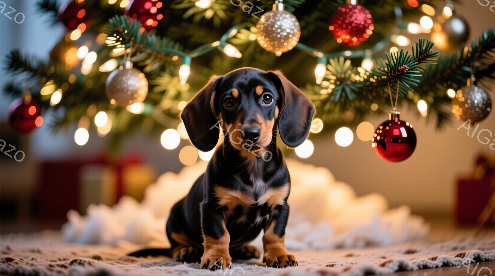 黒と茶色のダックスフンドの子犬が、白いカーペットの上に座ってこちらを見ています。背景には、ぼやけたクリスマスツリーと、暖かい光のイルミネーションが広がっており、お祝いムードが高まっています。子犬はリラックスした様子で、可愛らしい表情をしています。
