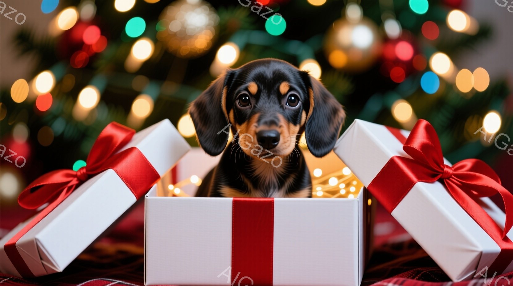 黒と茶色のダックスフントの子犬が、赤いリボンで結ばれた白いギフトボックスの中から顔を出しています。子犬は好奇心に満ちた表情で、少し上を見ています。背景には、ぼやけたクリスマスツリーの光が散りばめられ、暖かくお祝いムードに包まれています。