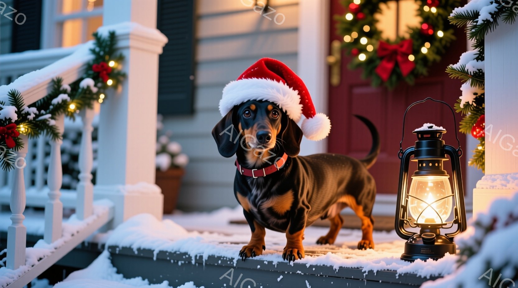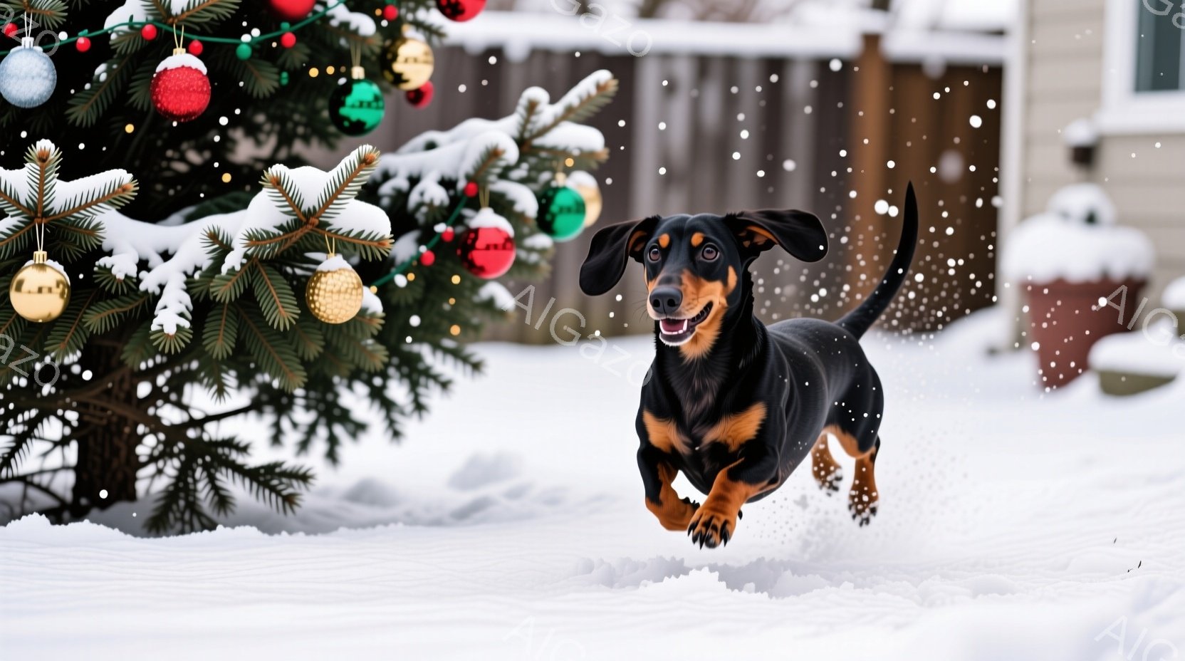 雪景色の中で、ダックスフンドが勢いよく駆け抜けている。クリスマスの飾り付けがされたモミの木が背景にあり、雪が舞っている様子から冬の暖かく楽しい雰囲気が伝わってくる。犬は首輪を付けており、活発で幸せそうな表情をしている。