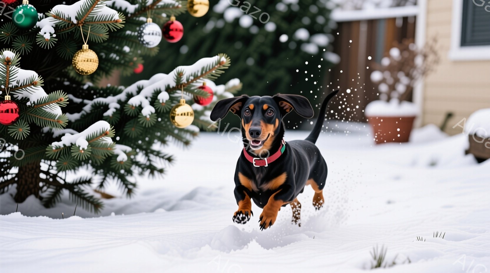 雪が降る庭で、ダックスフンドが勢いよく駆け抜けている。犬は黒と茶色の毛並みで、赤い首輪をつけている。背景には、クリスマスツリーのイルミネーションが輝き、雪に覆われた建物と自然が穏やかな冬の雰囲気を醸し出している。