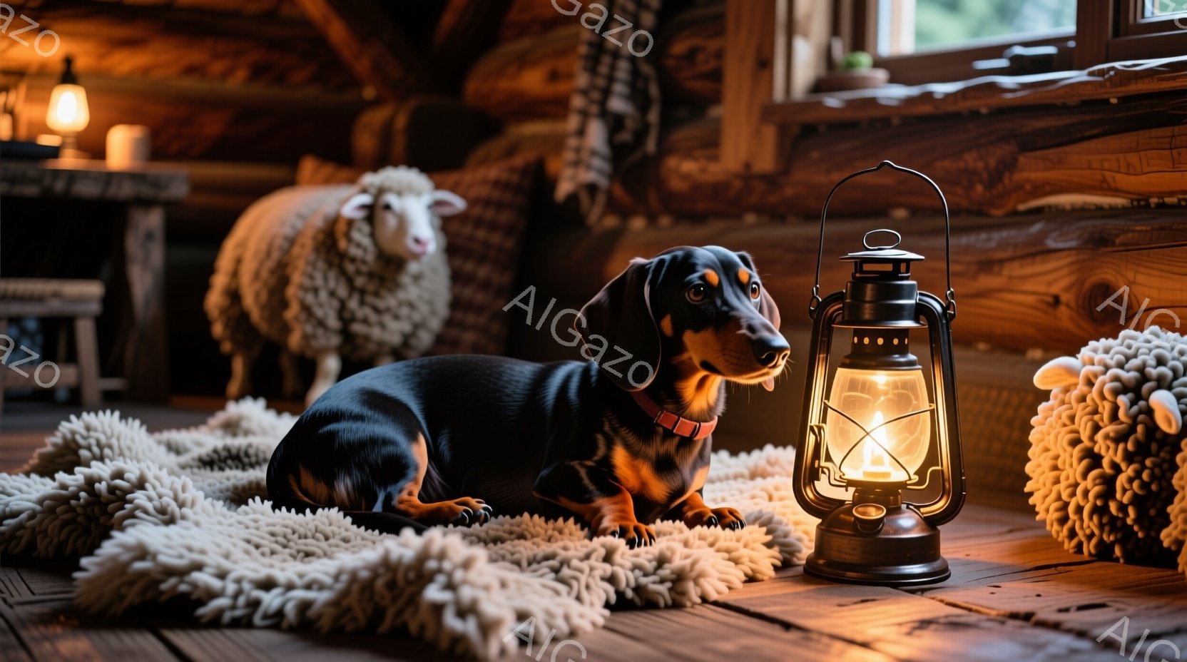 この無料AI生成画像「暖炉のある木の家の中に、チョコレート色のダックスフンドがふわふわの白いラグの上に横たわっています。背後には木製の壁と、ぼんやりと見える棚があり、アンティークランタンが暖かく光を放っています。全体的に、落ち着いた温かい雰囲気で、犬がリラックスしてくつろいでいる様子が伝わってきます。」は、2025年10月24日に作成されました。 サイズは 1664×928px の高解像度で、商用利用も可能なフリー素材として提供しています。