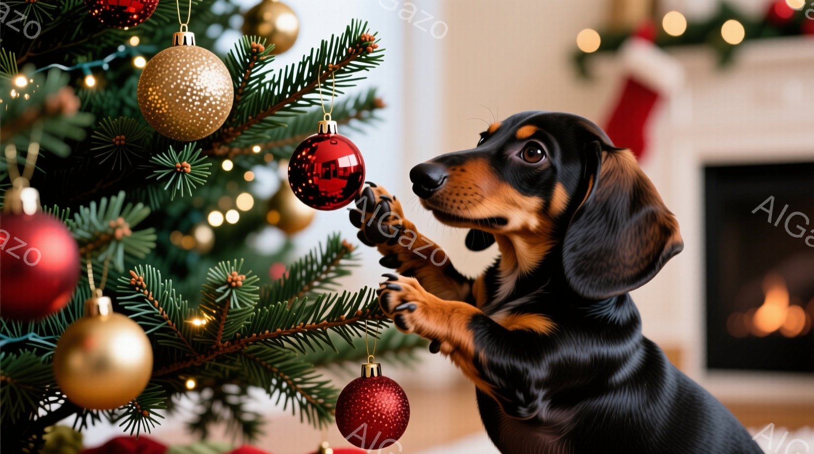 黒い毛並みに茶色のアクセントが入ったダックスフンドが、クリスマスツリーの飾りを見つめ、前足でそっと触れようとしています。背景には暖炉やクリスマスソックスが見え、室内は温かく、お祝いの雰囲気が漂っています。キラキラと輝くオーナメントと緑のツリーが、冬の праздничный сезонを感じさせます。