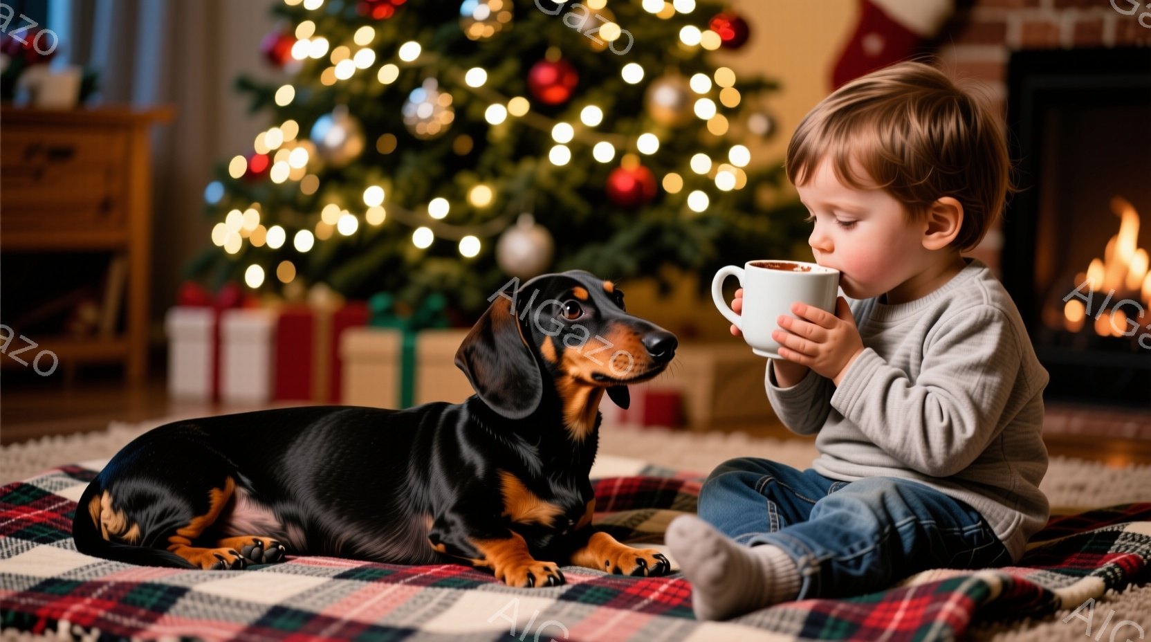 クリスマスツリーの前で、幼い少年がホットドリンクを抱えて座っています。少年は明るい色のセーターとジーンズを着ており、少し内気な表情で飲み物を見つめています。背景には、明るい光で飾られたクリスマスツリーと、リラックスした雰囲気を醸し出す赤いチェック柄の毛布、そして愛らしいダックスフンドが横たわっています。