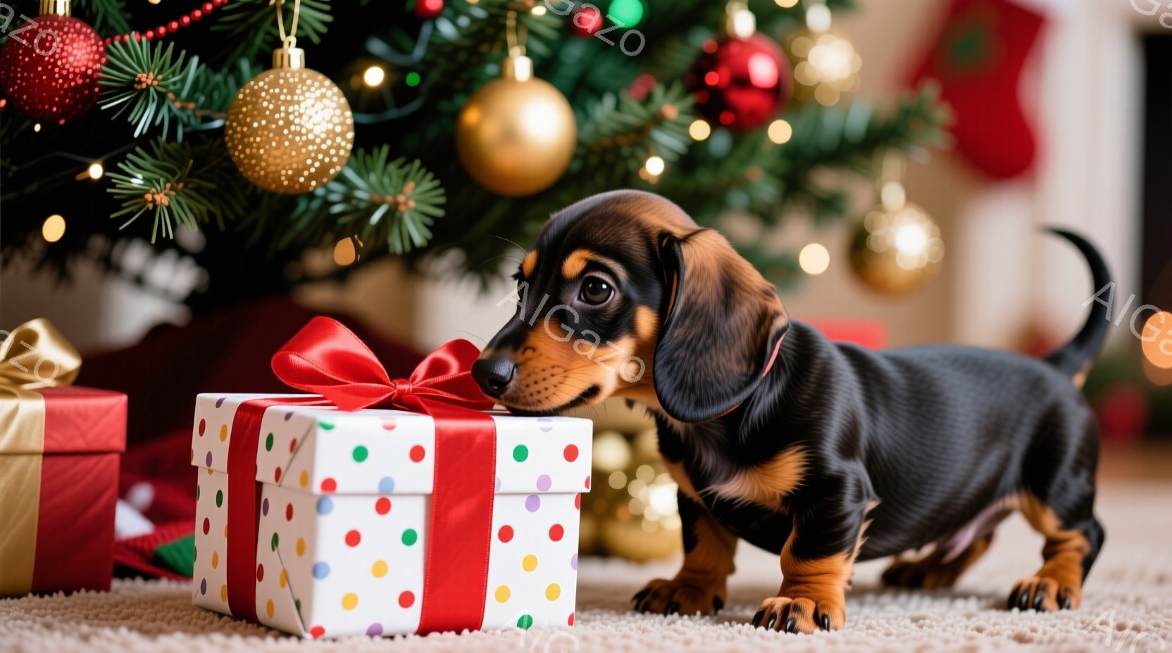 黒と焦げ茶色のダックスフンドが雪の降る窓辺に座り、外を見つめている。背景にはぼやけたクリスマスツリーの光が暖かく、室内はキャンドルの明かりで照らされている。雪の結晶模様が窓に描かれ、冬の穏やかで心温まる雰囲気を醸し出している。