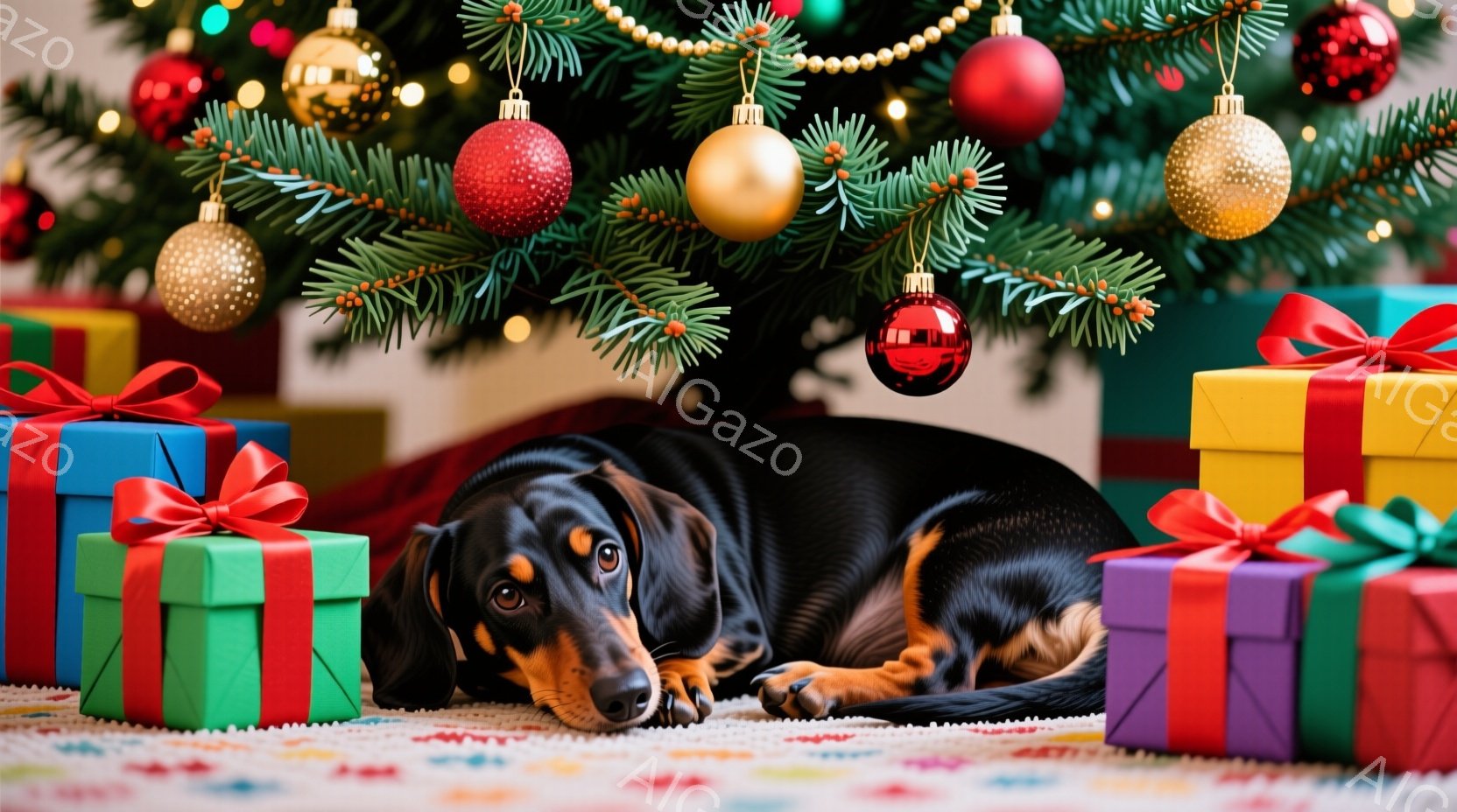 黒い毛並みに赤い首輪をつけたダックスフンドが、クリスマスツリーの下に置かれたプレゼントの山の中に横たわっています。犬は少し上目遣いでカメラを見つめ、穏やかでリラックスした表情をしています。背景には緑のクリスマスツリーが飾られ、明るい照明が暖かく優しい雰囲気を演出しています。