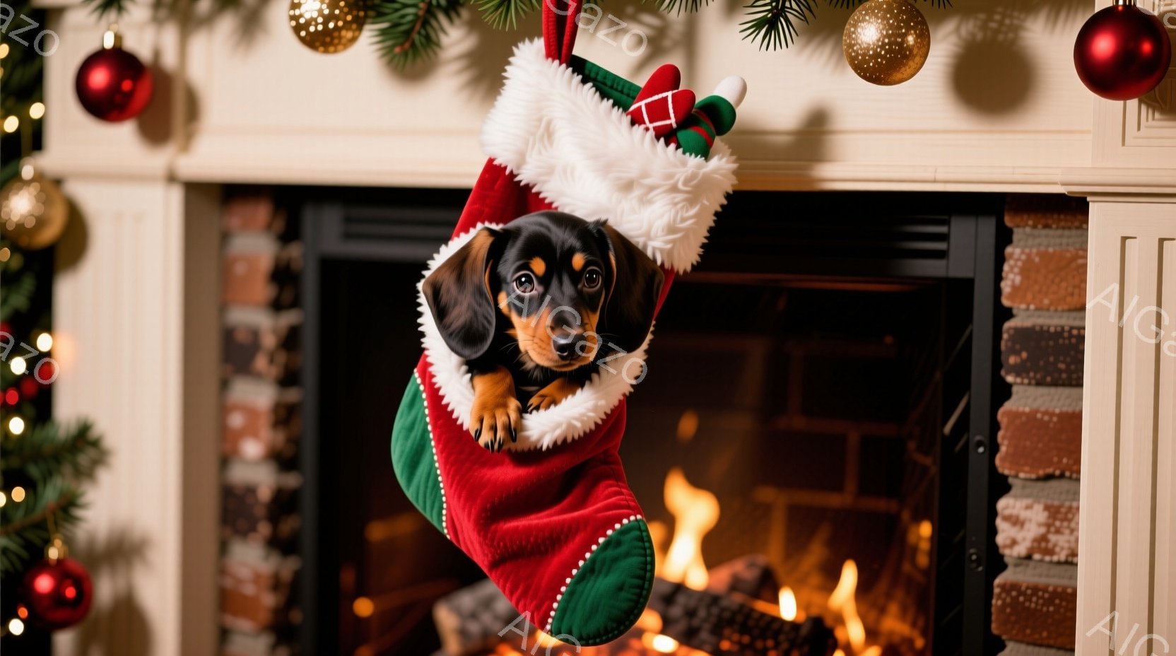 クリスマス柄の赤い靴下の中に、茶色と黒のダックスフントが可愛らしく顔を出しています。暖炉の前で、クリスマスツリーの輝く飾りとオレンジ色の炎が温かい雰囲気を醸し出しています。全体的に、クリスマスシーズンの喜びと安らぎを感じさせる一枚です。