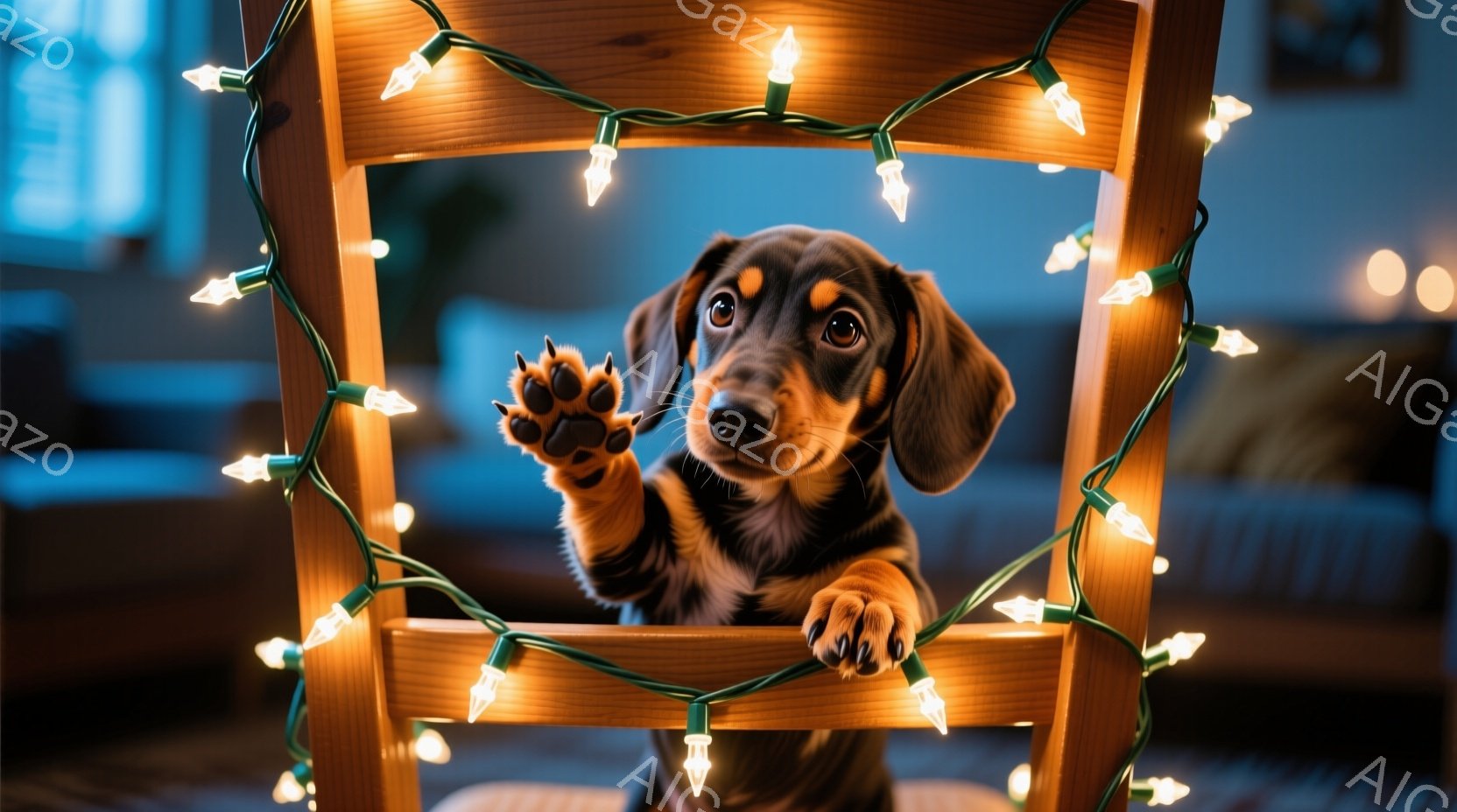 黒と茶色のダックスフンドの子犬が、背もたれの板の間に前足をかけて座っています。子犬は少し上目遣いで、いたずらっぽい表情を浮かべています。背景にはぼやけた室内が映り、クリスマスのイルミネーションが子犬を囲んで暖かく、楽しい雰囲気を醸し出しています。
