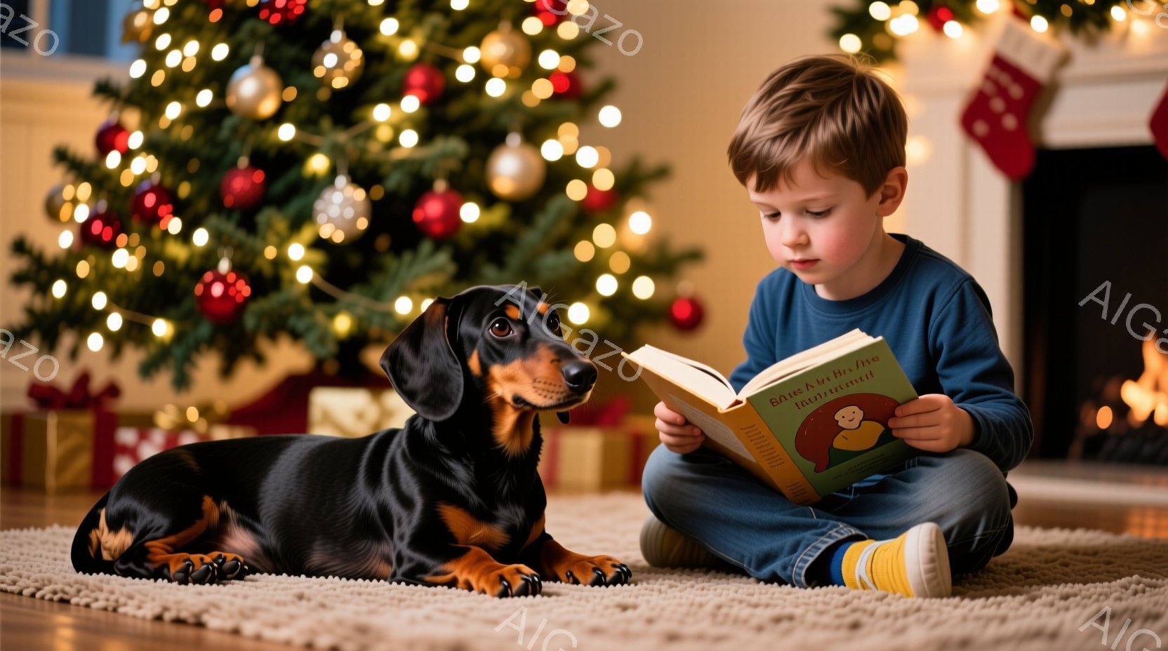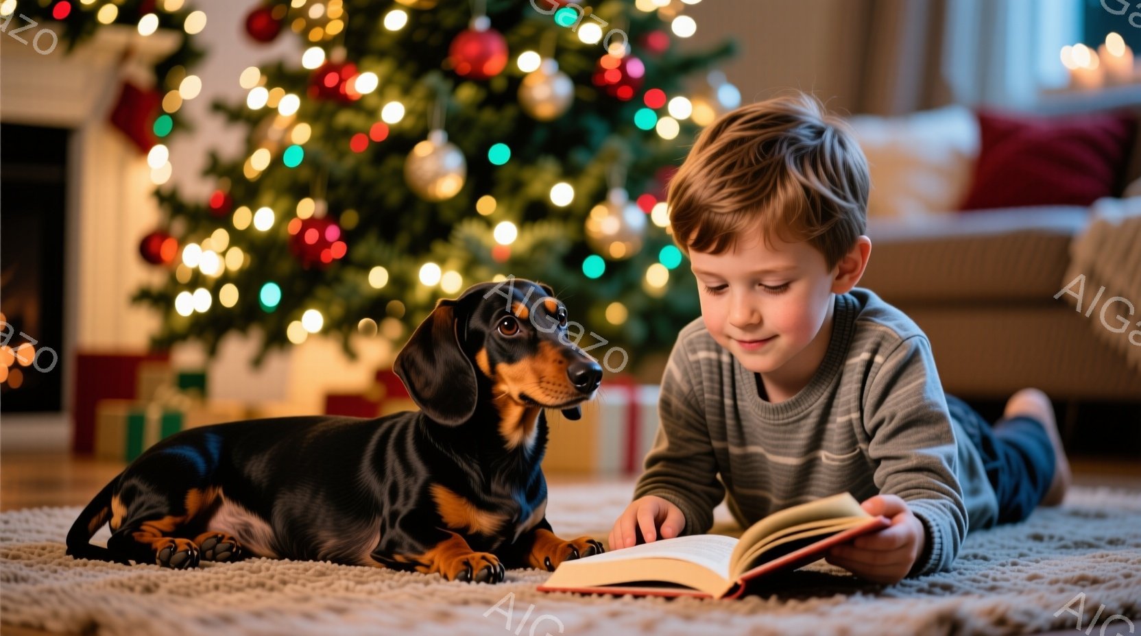 茶色い毛の少年が、クリスマスの飾り付けられたツリーのそばのカーペットの上で本を読んでいます。少年はグレーのセーターを着ており、横になって膝を曲げて本に集中した表情をしています。黒と茶色のダックスフントが少年の隣でリラックスして座っており、背景にはプレゼントと暖炉が見え、温かく穏やかなクリスマスの雰囲気です。