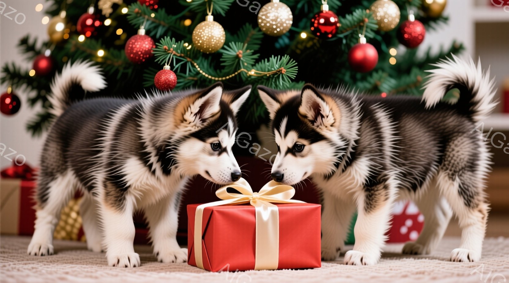 2匹の子犬がプレゼントの箱の周りに集まっています。子犬たちは白い足と灰色の毛並みで、鼻を箱に近づけて興味津々な表情をしています。背景にはクリスマスツリーとプレゼントの山があり、暖かくお祝いムードに満ちた雰囲気です。