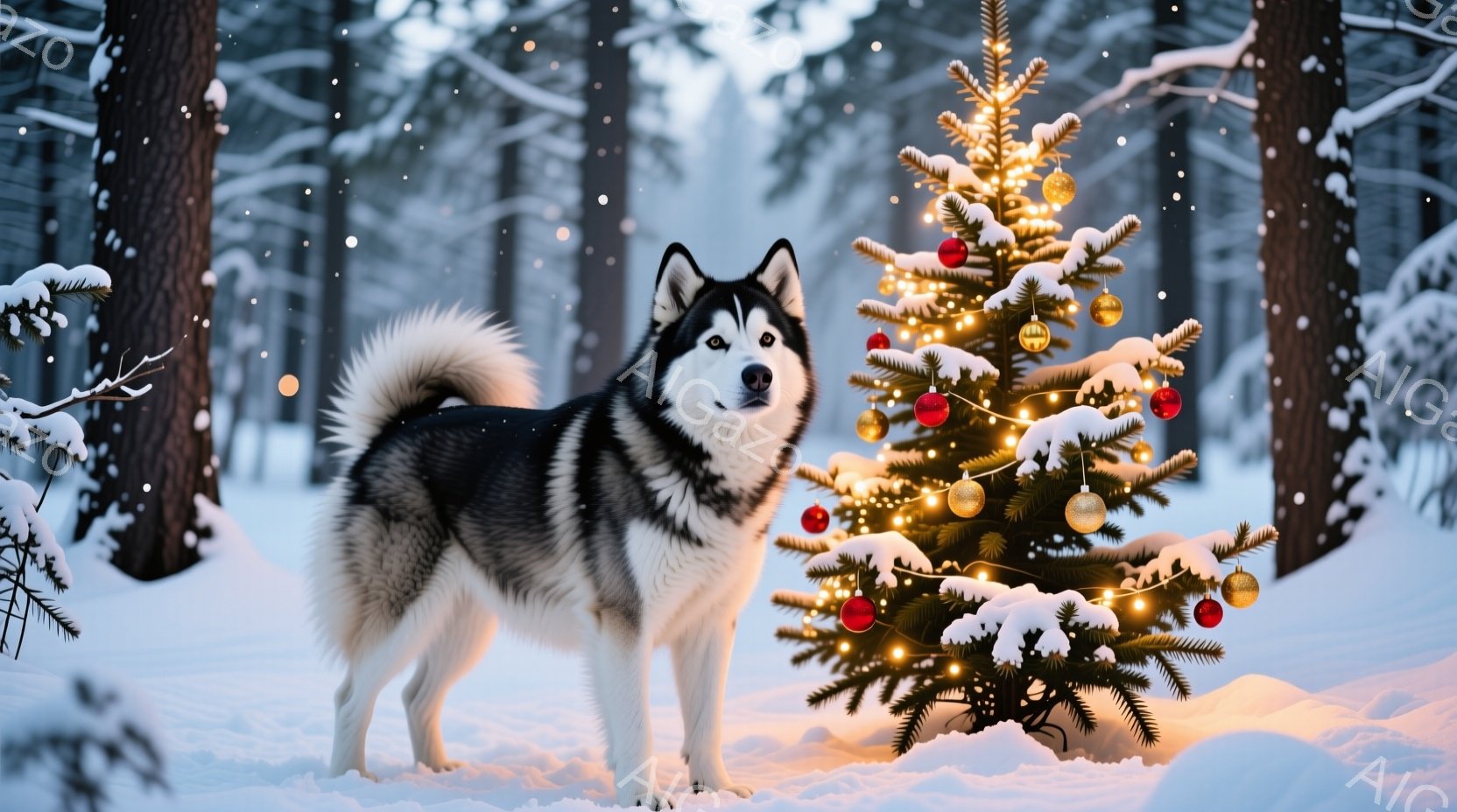 白と黒のシベリアンハスキーが雪景色の中でクリスマスツリーの隣に立っています。ツリーは飾り付けられ、雪が降り積もる森の中は幻想的な雰囲気を醸し出しています。ハスキーは凛々しい表情でカメラを見つめ、冬の静寂の中に力強さを感じさせます。