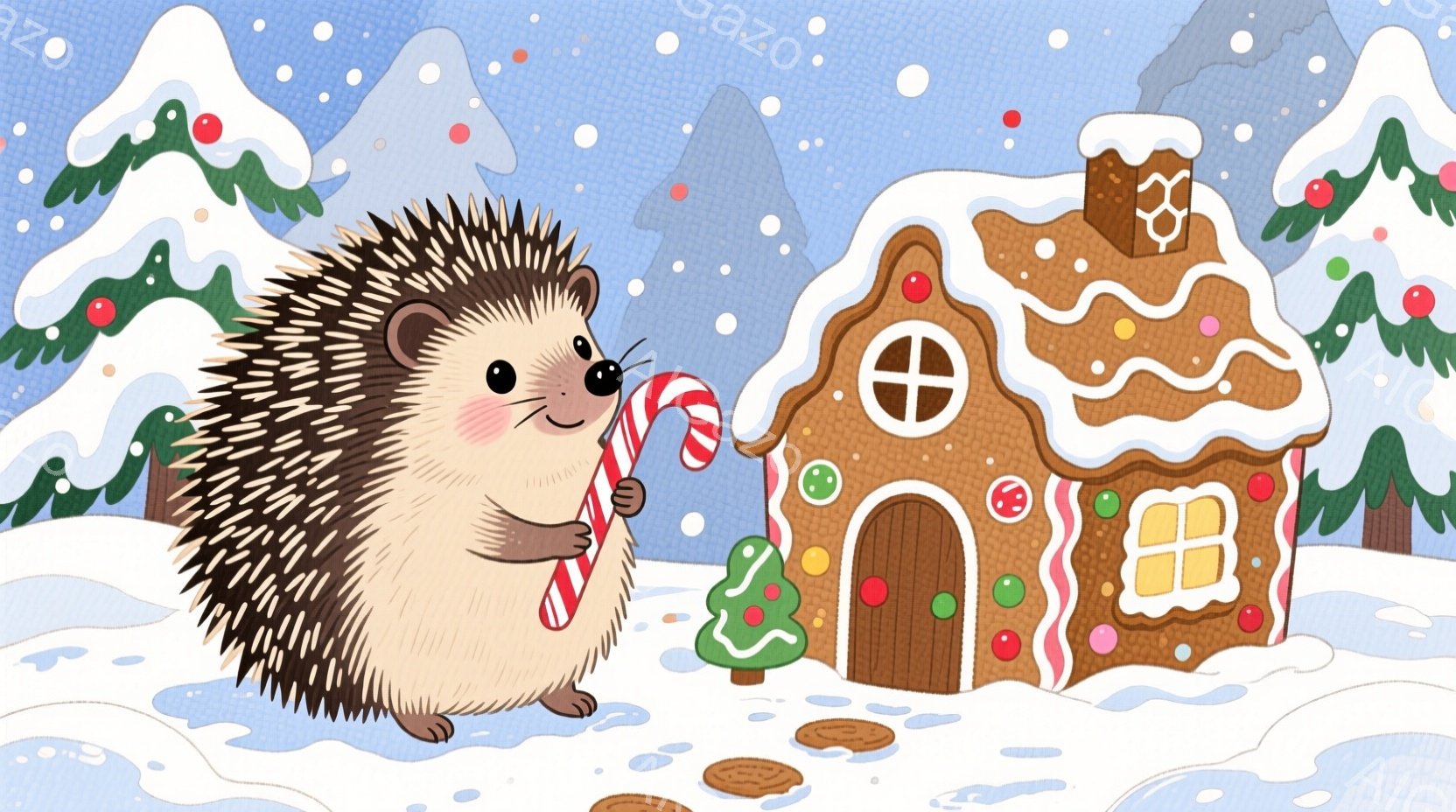 雪が降る冬の風景の中に、可愛らしいハリネズミが立っています。ハリネズミはピンク色の頬を持っており、片手にキャンディケーンを持って楽しそうに微笑んでいます。背景には、ジンジャーブレッドで作られた家があり、クッキーが散りばめられた道が家へと続いています。