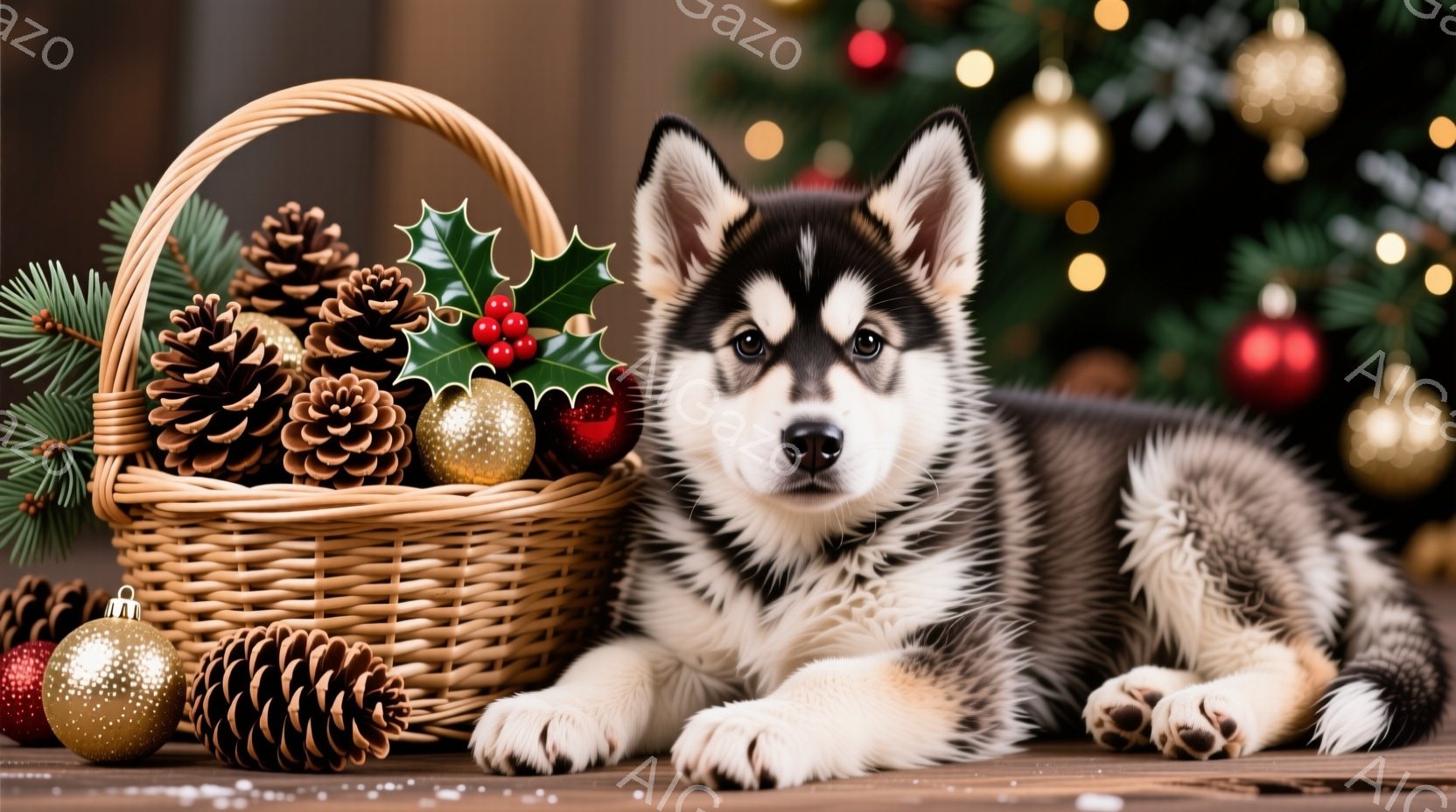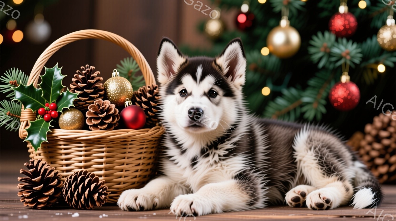 灰色の毛並みの子犬が、木の板の上に横たわっています。そばには、松ぼっくりや赤いオーナメントが入ったバスケットが置かれ、背景にはクリスマスツリーの緑が広がっています。暖かく、穏やかなクリスマスの雰囲気が感じられます。