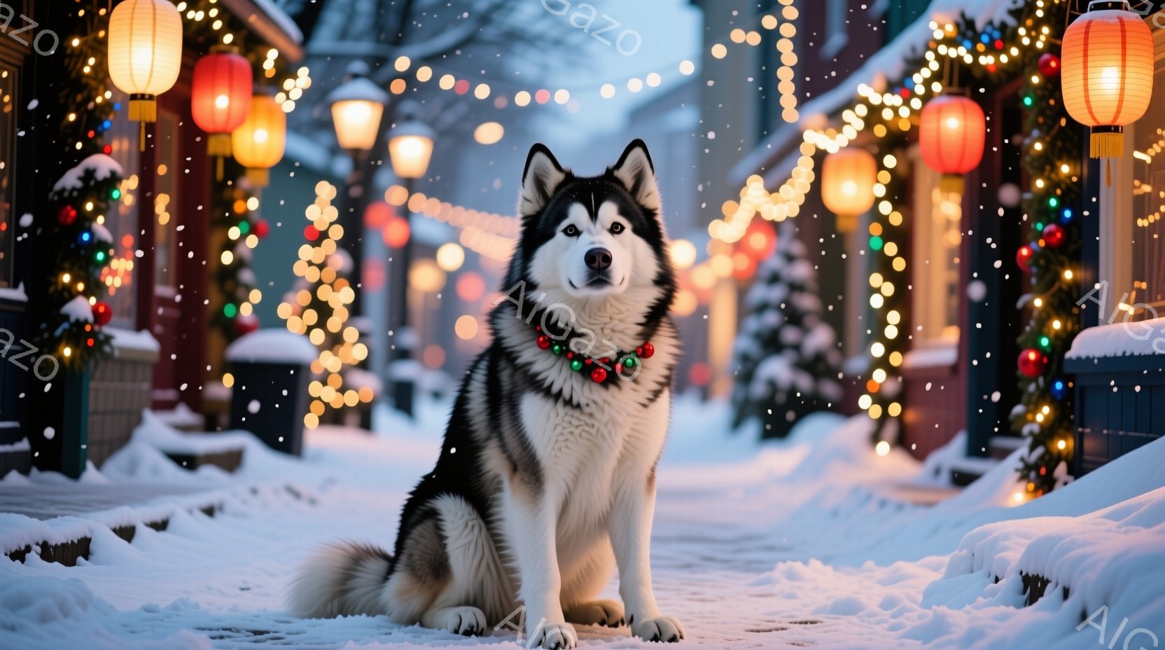 雪が降り積もる通りに、シベリアンハスキーが座っています。背景には、クリスマスの飾り付けがされた街並みが広がり、暖かく幻想的な雰囲気を醸し出しています。犬はまっすぐ前を見ており、堂々とした姿勢が印象的です。