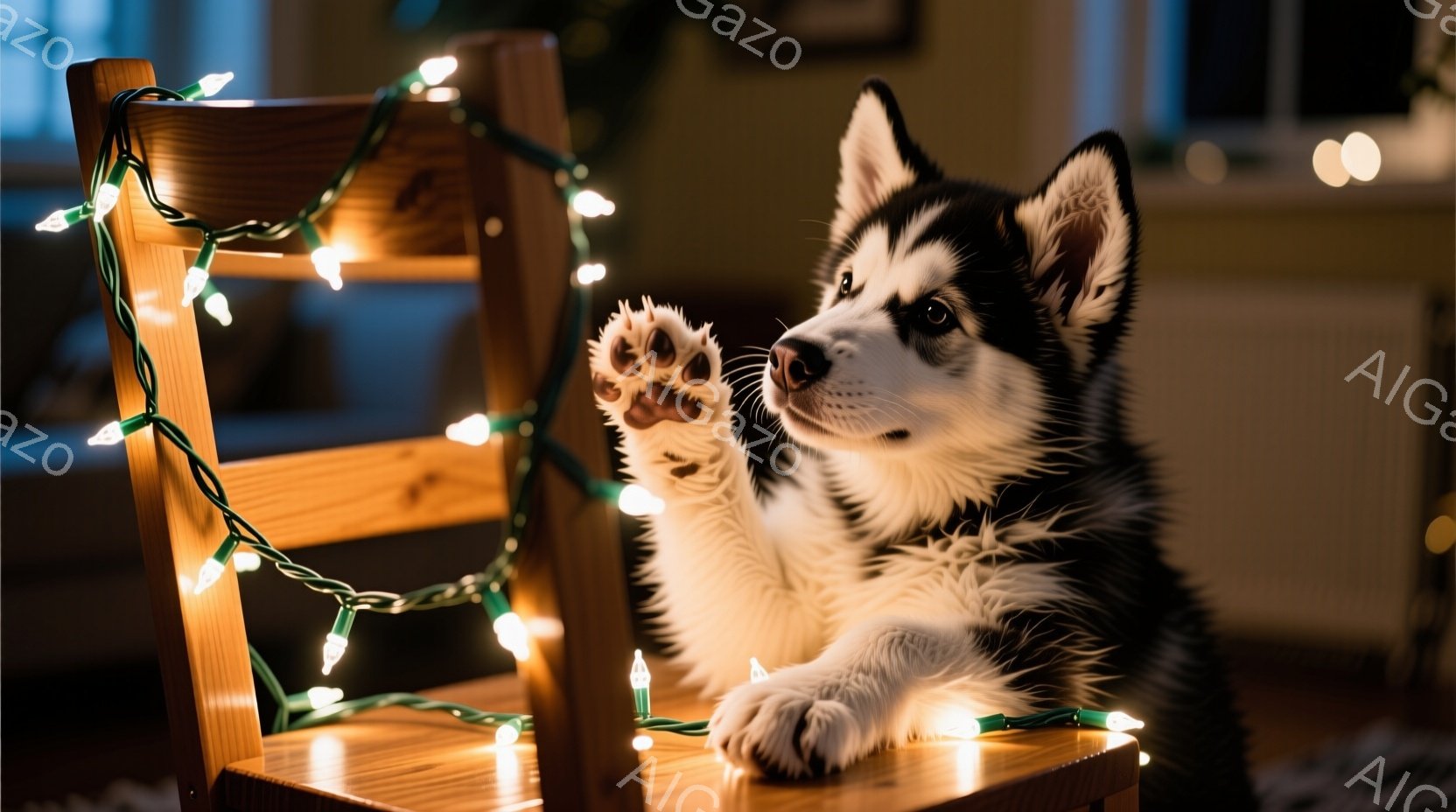 白と黒のハスキーの子犬が、クリスマスライトに飾られた折りたたみ椅子にリラックスして座っています。前足を伸ばして、まるで挨拶しているかのように片足を少し上げています。背景はぼやけていますが、暖色系の照明と家具が見え、全体的に温かく、遊び心のある雰囲気が漂っています。