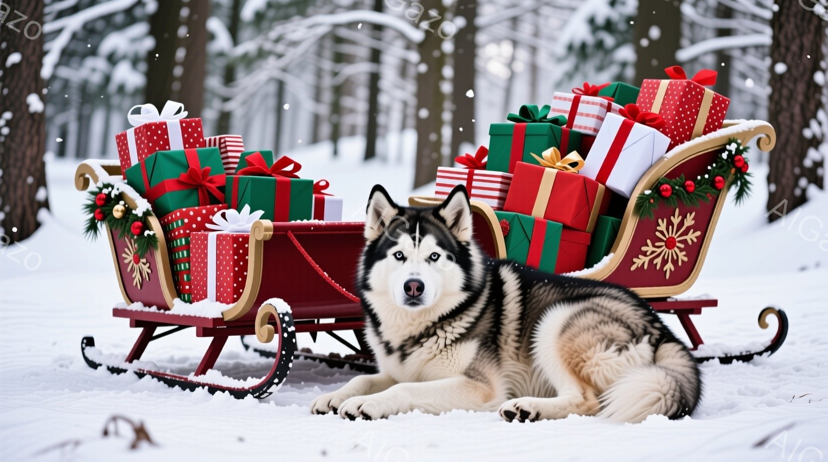 雪景色の中に、プレゼントが積み込まれたそりが置かれ、そのそばにシベリアンハスキーが横たわっています。犬は赤い首輪をつけており、まっすぐ前を見つめて、落ち着いた表情をしています。背景には雪をまとった木々が立ち並び、冬の静寂で穏やかな雰囲気が漂っています。