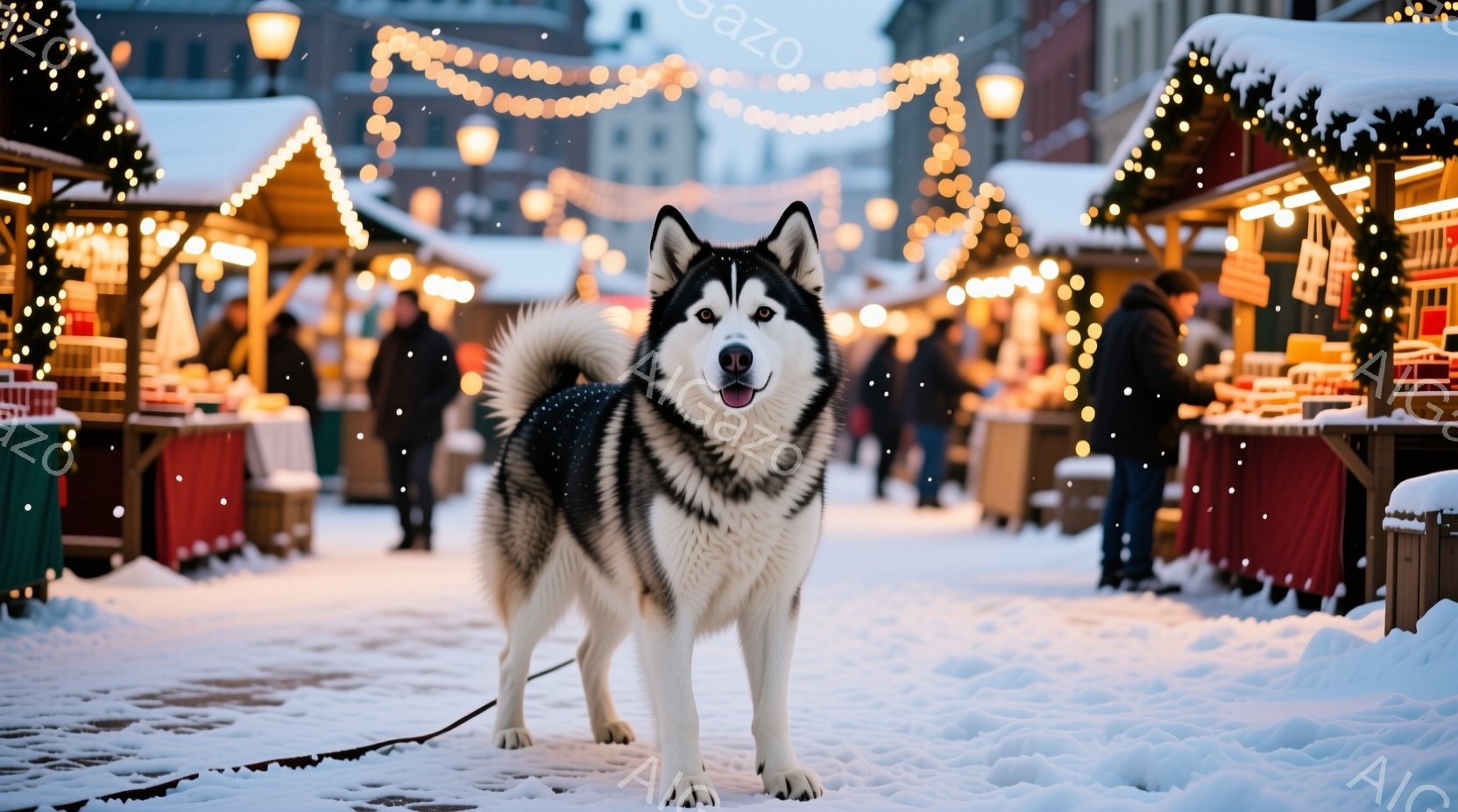 白と黒のシベリアンハスキーが雪に覆われた祭りの通りで堂々と立っている。背景には、温かい光で飾られた屋台が並び、人々が歩いているのがぼんやりと見える。全体的に、冬の祭りの暖かく活気のある雰囲気が漂っている。