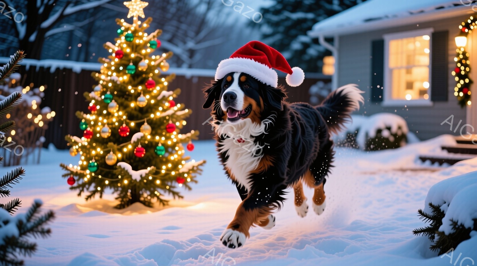 雪景色の中で、サンタの帽子を被ったベルニース・マウンテン・ドッグが勢いよく駆けている。背景には、イルミネーションで飾られた家と、輝くクリスマスツリーがあり、暖かく幸せな雰囲気を醸し出している。雪が舞い、犬の表情は喜びと興奮に満ちている。